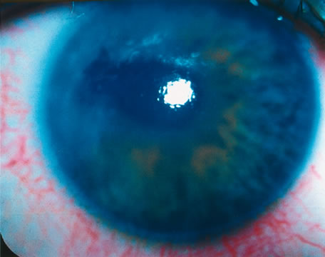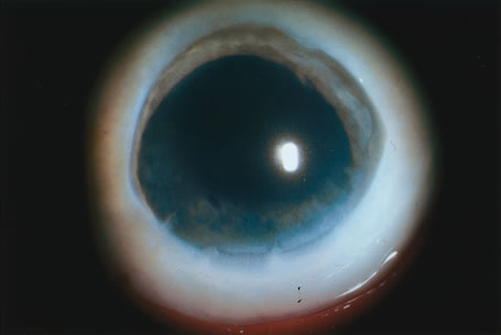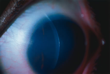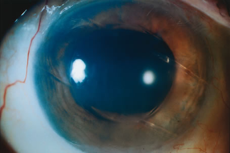 In stage 2, patients have painless decrease in vision and symptoms of glare and halos around lights, which are usually more severe on awakening. These symptoms are primarily caused by varying degrees of epithelial and stromal edema. Epithelial edema can be seen as small droplets (bedewing) on slit lamp retroillumination. Decreased evaporation of tears during sleep causes increased tear osmolarity and promotes increased edema and decreased visual acuity on awakening. Stage 3 develops after epithelial microcysts coalesce to form bullae. The bullae eventually burst and produce varying amounts of pain, hence the name bullous keratopathy (Fig. 7). Wrinkles in Descemet's membrane known as striae develop as the cornea thickens posteriorly because of stromal swelling. These striae form when the cornea swells as a result of shortening in the arc of Descemet's membrane from limbus to limbus. As the microcystic epithelial vesicles break, foreign-body sensations and severe pain ensue along with more extensive corneal epithelial disruption. Recurrent corneal erosions, microbial ulceration, and persistent pain may occur during this stage.