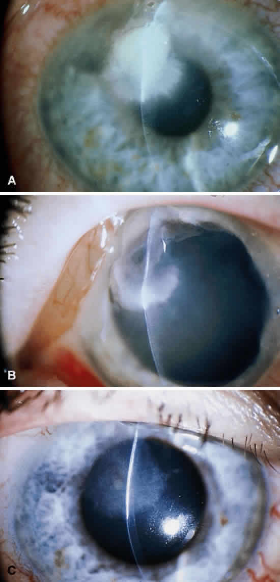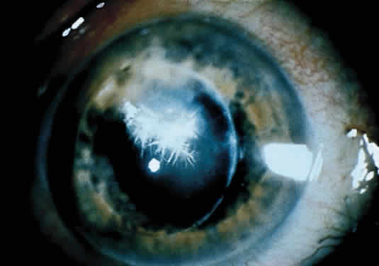 Infectious crystalline keratopathy is most commonly associated with S. viridans infection.43–45 This keratitis is characterized by discrete, white, crystalline, or fern-like stromal opacities, often under an intact epithelium, that are slowly progressive and have little associated corneal inflammation (Fig. 7). There is a strong association with prior topical corticosteroid therapy or penetrating keratoplasty. The condition has been termed infectious crystalline keratopathy and also has been reported with other organisms, including Haemophilus aphrophilus, Peptostreptococcus, and Staphylococcus epidermidis, as well as the fungal infections Alternaria and Candida tropicalis.46–49