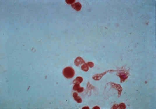 PSEUDOMONAS Pseudomonas is a Gram-negative rod that is ubiquitous in our environment and is a common cause of bacterial keratitis. The organism is a slender rod with parallel sides and rounded ends. There are 30 species within the genus; however, Pseudomonas aeruginosa is by far the one that is most often implicated in keratitis. Xanthamous P. maltophilia and P. cepacia are also well recognized corneal pathogens; P. stutzeri and P. acidovorans are blamed more rarely.57 The members of this genus are usually free-living bacteria and are considered opportunistic pathogens. Pseudomonas aeruginosa is easily seen on Gram stain, although there tends to be a paucity of organisms (Fig. 8), in contrast to pneumococcal ulcers (see Fig. 4). The organism is easily grown on a variety of substances and can tolerate a wide temperature range, but is an obligate aerobe. The oxidase test is positive early in almost all pseudomonas infections and can be helpful for rapid identification. Pseudomonas aeruginosa has a distinctive “fruity” odor, is extremely active and motile on wet mounts, and elaborates two pigments (fluorescein and pyocyanin) with a striking blue-green color.