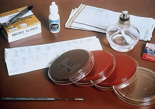Because the patient's history and clinical appearance are inadequate for making a specific bacterial diagnosis, laboratory investigation is mandatory for serious corneal ulcers. Although most laboratories have appropriate stains, incubators, media, and technicians to aid in the interpretation of this data, it is the clinician's responsibility to collect this data in an efficient and purposeful manner (see Laboratory Diagnosis). On many occasions, patients present with corneal ulceration when laboratory personnel are not available, requiring the ophthalmologist to be ready and able to perform the initial work independently. It is most helpful to have a prepared corneal ulcer diagnostic tray that is easily accessible and contains the necessary instrumentation for securing specimens. This tray should include the following (Fig. 12): alcohol lamp and matches, platinum (Kimura or Lindner) spatula, sterile calcium alginate swabs, clean glass slides, topical anesthetic drops, grease marking pen, and laboratory forms for bacteriology. Prior discussions with the bacteriology laboratory regarding the location of culture media, stains, and a microscope help avoid frustrating situations when laboratory personnel are not in attendance. Once the microbiologic work-up has been completed and the stained smears have been carefully examined, the therapeutic approach should be formulated and treatment begun. |