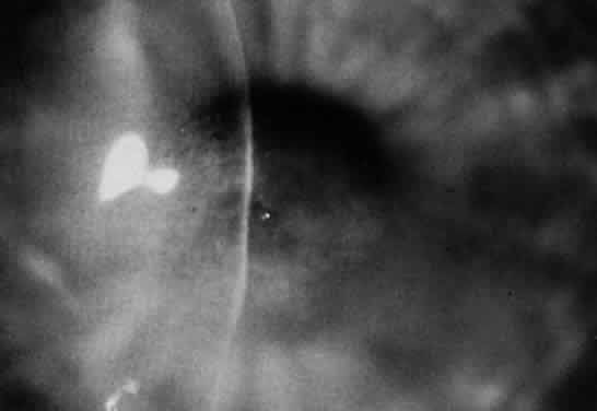 Persistent epithelial erosions occur in a vast majority of cases. Occasionally these epithelial erosions begin as coarsely elevated, dendritiform lines that break down early, which may explain why a great majority of patients undergo treatment for herpes simplex.34 Histopathologic examination as well as cultures taken from these lesions have been reported positive for Acanthamoeba.30 After some form of epithelial involvement, stromal infiltration develops, usually in the central or paracentral cornea. Initially its appearance is not characteristic and involves the anterior stroma as a serpiginous, gray-white infiltrate with an overlying epithelial defect (Fig. 3). Small satellite lesions and edema may develop around the main infiltrate. As the infection progresses, the infiltrate becomes most dense at its peripheral aspects, forming the characteristic annular infiltrate (Fig. 4). This ring is considered the hallmark of Acanthamoeba keratitis; however, it usually occurs only in more advanced cases.3,15,30,34,37 It may be segmental or circumferential, with stromal thinning or furrowing and a variable overlying epithelial defect.