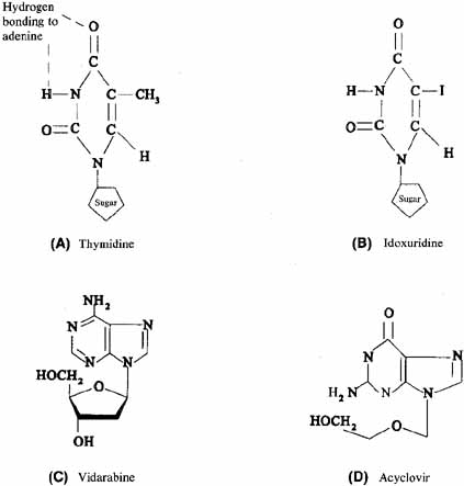 Such an approach is possible only if the ophthalmologist maintains a clear perspective of the chronic, recurring, progressive course of this disease. The nature of herpetic keratitis is such that these aims are often in conflict. The topical antiviral agents used are inherently toxic and the vigilance needed to manage the patient carefully for protracted periods of time is demanding, as well as potentially socially and economically crippling. Only currently established methods of treatment are included here. Controversial therapies and drugs, given the experimental stage of development, are not discussed. Antiviral Measures MECHANICAL DEBRIDEMENT At one point, mechanical debridement was the only effective means of treating epithelial herpes. Even with the advent of antiviral agents, it remains a useful, safe, and sometimes preferred alternative.35 The removal of virus-replicating epithelium abolishes the source of infection for other cells and eliminates an antigenic stimulus to inflammation in the adjacent stroma. Debridement should be performed at the slit lamp or operating microscope, with the use of topical anesthesia. Controlled removal of the lesion is best achieved by gentle debridement along the margins of the epithelial ulcer with a tightly rolled cotton-tipped applicator. With this technique, known as minimal wiping debridement, the virus-infected cells are removed while healthy epithelium is left intact.36 Sharp knife blades should not be used because of the risk of creating a portal of entry into the stroma through damage to underlying Bowman's layer. Recrudescence of viral replication occasionally occurs and can be treated by repeat debridement or administration of an antiviral agent. Chemical virucidal agents, such as phenol 10%, have been advocated to sterilize the freshly debrided ulcer margins but are unnecessary. Scrubbing the bare surface is injurious, and iodine is damaging, especially to diseased corneal stroma. CHEMOTHERAPY. Idoxuridine (IDU), the first antiviral drug to become available for topical ophthalmic use, is a substituted pyrimidine nucleoside that resembles thymidine (Fig. 2).It is phosphorylated to the nucleotide and incorporated into the DNA of all cells, where it interferes with DNA interactions.