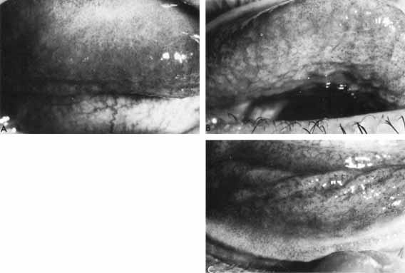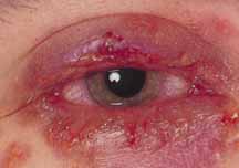 CLINICAL MANIFESTATIONS Primary ocular herpes is predominantly a disease of infants and young adults, but it can occur sporadically at all ages. Neonatal infection is caused by HSV-2 in approximately 80% of cases. The scant emphasis that primary herpetic infection has received in the literature is regrettable in view of its importance as a cause of follicular conjunctivitis or keratoconjunctivitis.11 These conditions remain largely unrecognized, therefore, affected patients may be exposed unwittingly to the hazards of corticosteroid administration. Although this section is principally concerned with the keratitis that often follows primary follicular conjunctivitis, it would be unrealistic to consider it as an entity distinct from the primary syndrome. Symptoms of infection appear 2 to 12 days after contact with an infected individual (although not necessarily one with an active lesion). In contrast to the recurrent form of the disease, there is mild malaise and fever, indicating a constitutional illness. Conjunctival injection, irritability and watery discharge are typically unilateral and rarely severe. The patient or parents, whose chief concern may be the skin lesions adjacent to the eye, may not even mention the ocular disease. The follicular conjunctivitis of primary herpes is associated with a regional adenitis. Typically, the ipsilateral preauricular lymph node is slightly enlarged and a little tender. Swollen lids and a primary skin lesion are often readily apparent (Figs. 3 and 4), but on occasion only a careful search will reveal the single or grouped vesicles of crusted ulcers (Figs. 5 and 6) hidden among the lashes or in the intermarginal strip. Similar lesions may be located elsewhere on the face or at the mucocutaneous junction of the mouth, in the nose, or on the trunk, and they may be easily missed unless a specific search is made. In nearly one fourth of cases, no cutaneous lesions are present.35 The conjunctiva is injected and edematous. Follicles develop, especially in the fornices, and extend to the tarsal areas (Fig. 7);they rarely occur at the limbus. Small subconjunctival ecchymoses are not uncommon and phylectenule-like lesions may develop on the globe (Fig. 8).