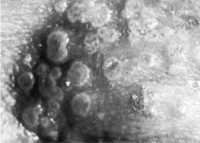 Within 2 weeks, approximately half of these patients develop corneal lesions associated with only relatively minor symptoms: a little grittiness, photophobia, and blurring of vision. Initially these lesions are epithelial and present a variety of appearances. A fine punctate epithelial keratitis, consisting of tiny white flecks in the superficial layers that stain poorly with fluorescein and variably with rose bengal, may be present. These are transient spots, only rarely progressing to larger lesions. As the flecks desquamate, fluorescein stains the flecks more intensively during the healing stages. A coarse punctate epithelial keratitis presenting a variety of shapes (circles, ovals, irregular elongated areas, and stellate figures) may appear. Any of these lesions may progress to macroscopic dendritic figures. They consist of slightly raised, closed clusters of opaque epithelial cells, those in the periphery often being the most regularly arranged. These swollen white cells stain well with rose bengal but poorly with fluorescein. Typical herpetic intranuclear inclusions can be demonstrated in these cells (Fig. 9).Initially, there is no stromal reaction, but within 2 to 3 weeks, and sooner if the lesions are peripheral (and regardless of epithelial healing), subepithelial infiltrates appear.35 DIAGNOSIS AND DIFFERENTIAL DIAGNOSIS The diagnosis can be made on clinical grounds alone in patients with typical cutaneous lid lesions or typical herpetic corneal lesions. In the absence of such lesions (approximately one fourth of all patients with primary herpetic conjunctivitis), laboratory investigations are essential for diagnosis. The differential diagnosis includes: