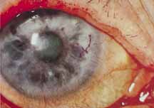 Anterior uveitis is invariably present although it may be difficult or impossible to assess because of the corneal opacification. In severity it varies from the presence of an occasional cell and minimal flare to the development of hypopyon. Posterior synechiae and rubeosis iridis frequently complicate severe cases. The intraocular pressure may be elevated in the acute stage as a result of an associated trabeculitis. Vascularization can occur at any stage of the disease process. Vessels penetrate the stroma from the limbus at all levels to invade the active stromal lesion. They are often cuffed by fine granular infiltrates while active but, as the inflammatory process subsides, they lose the cuff of cells and may eventually become almost bloodless. The first signs of a recrudescence of inflammation may be the reactivation of these vessels. During the acute stages of the inflammatory reaction, scarring may not be obvious, but as the signs of inflammation subside, it becomes more apparent. In the early stages the discrete white opacification may easily be mistaken for infiltrate. Once significant scarring has occurred, the clarity of the cornea is permanently impaired (see Fig. 20). Loss of corneal substance, ranging from minor faceting to gross thinning or even perforation, is of variable occurrence. It often relates to preceding dense infiltration and is most frequently seen in the rebound phenomenon following withdrawal of topical steroid therapy for stromal herpetic keratitis with dense infiltration (Fig. 26).