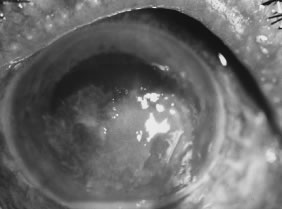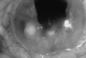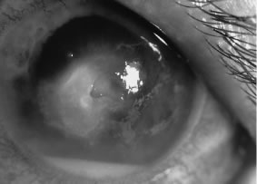 to the point of extreme corneal thinning, dense fibrinous exudate