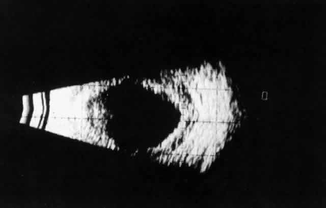 Radiologic investigations should include a chest roentgenogram and a roentgenogram of the sacroiliac joints. Physical examination may not reveal sacroiliitis of the rheumatoid type. Because this may be the only other systemic manifestation in scleral disease, this investigation should not be omitted. Roentgenograms of other joints are taken if a particular disease process such as gout, rheumatoid arthritis, or sarcoidosis is suspected. Prick and patch testing of the skin has been universally unrewarding even when a known sensitizer has been found. Local challenge has been attempted, but the results are inconclusive. Electroretinography and electro-oculography are of assistance only in the presence of cataract or severe necrotizing or posterior scleritis. There is sometimes a dramatic fall in the electric response at the onset of disease and an equally dramatic rise when the disease is suppressed, provided destructive changes have not occurred. B-scan ultrasonography should never be omitted from the examination of patients with scleritis. Now that high-quality ultrasonography has become available, the extent and severity of the inflammation can be determined with great accuracy. Many patients who were formerly thought to have only anterior segment disease have been found to have extensive and sight-threatening posterior scleritis as well. It also has become known that many patients with posterior scleritis with few symptoms and signs have much more extensive disease than had previously been considered possible (Fig. 9). Anterior segment B-scan ultrasonography sometimes reveals extensive involvement of the deep scleral tissue around the ciliary body, indicating the need for urgent and intensive use of immunosuppressive therapy.