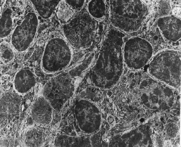 What is clinically represented solely by inflammation and edema is histopathologically a granulomatous lesion of the sclera, the center of which consists largely of plasma cells, lymphocytes, and mast cells (Figs. 21 through 23). Foster and colleagues have identified the cellular subsets and glycoproteins in both necrotizing and non-necrotizing scleritis.22 This shows an active T-cell inflammatory response with a high CD4/CD8 ratio and increased HLA/DR and CD14, indicating a macrophage-induced response that would lead to granuloma formation. Remote from the granuloma, the fibrocytes of the sclera become activated, the proteoglycan adjacent to them becomes altered, and the collagen fibrils of the sclera become unraveled (Figs. 23 and 24). These changes appear to take place prior to the invasion of the stroma by cells of the granuloma.20 The vessels in and around the necrotic area show medial necrosis and perivascular cuffing with lymphocytes, and endothelial swelling with microvascular occlusion. Ninety-six percent of the specimens examined by Foster and associates show a microangiopathy characterized by a neutrophil infiltrate in and around the vessel wall.22–23 This is most obvious at the center of the lesion where there may be occlusion of the vessel, thrombosis, or even aneurysm formation (Fig. 25). From these pathologic investigations, clinical observations, animal experiments, and the results of fluorescein angiography, it would appear that the scleral inflammation is initiated either by trauma (be it accidental or surgical)23–25 or by bacterial or viral infection. If circulating immune complexes are present because of the poor blood flow, they become precipitated in and around the vessel walls in the area of inflammation. In other patients, a persistence of tissue damage will lead to autoimmunization. Damage to the endothelial cells of the microvasculature leads to changes within the vessels detectable on angiography and to catabolic changes in the surrounding tissues. These changes, in turn, allow the granulomatous response that is seen in histopathologic sections, the first detectable change being in the scleral fibrocytes and the proteoglycan and collagen remote from the site of cellular infiltration.