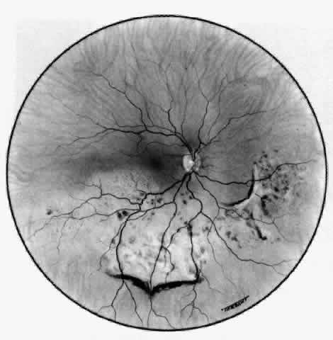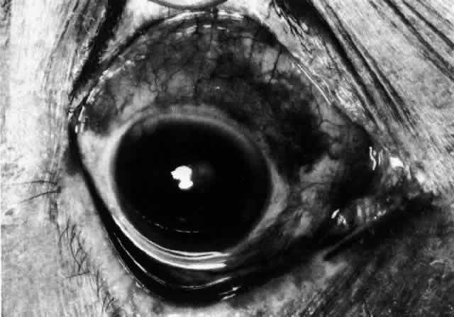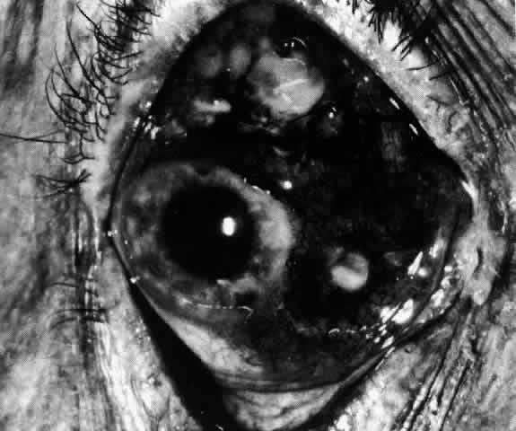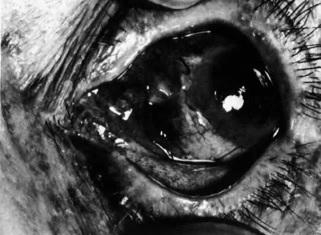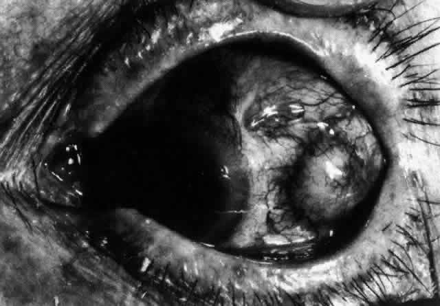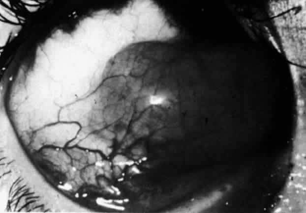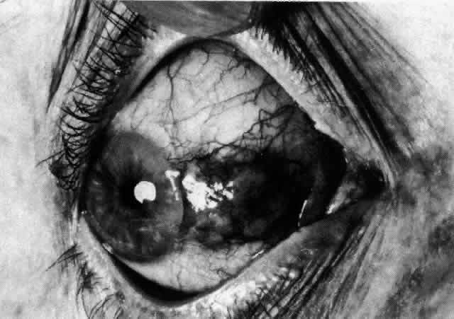 An anterior staphyloma has an abrupt sharp margin with no surrounding inflammation. The scleral thinning is irregular; the numerous ridges on the surface are made more obvious by the dark underlying choroid. Glaucoma is frequently associated with anterior or intercalary staphylomas, and detachment of the retina with equatorial and posterior staphylomas. |