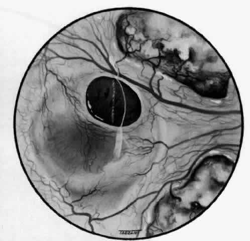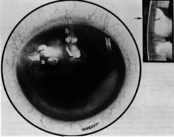 SPONTANEOUS INTERCALARY PERFORATION A spontaneous intercalary perforation describes a small well-defined hole that appears in the sclera of young individuals without any signs surrounding the inflammation. Initially, the hole grows slightly in size and then remains stationary. Sometimes fluid is driven through the hole subconjunctivally and choroidal tissue becomes incarcerated in it. A small vessel appears to run through the defect to anastomose with the posterior ciliary circulation. These small communicating vessels are not uncommonly seen in normal individuals, sometimes running in the same channels as the aqueous veins. It is at these sites that spontaneous intercalary perforations occur. The perforations are entirely benign and nonprogressive expansions of the normal perforating channels. They require no treatment. |