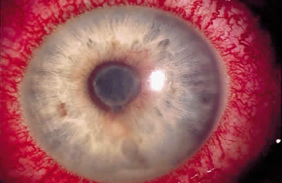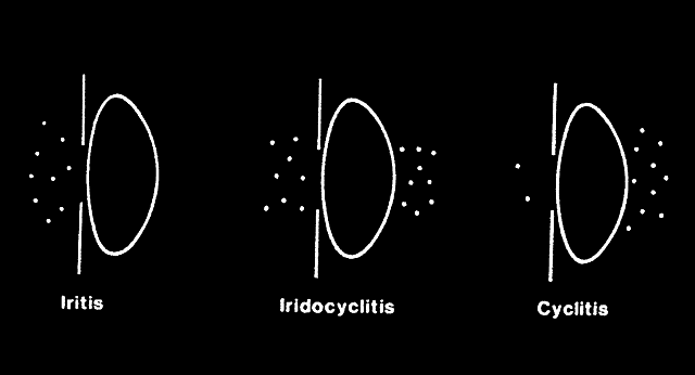 PAIN The pain of iritis is primarily related to ciliary spasm. The ciliary body is innervated by the trigeminal nerve, and pain caused by its inflammation may therefore radiate to the periorbital region and to the eye. Because branches of the trigeminal nerve supply the cornea and iris, inflammation of these areas can cause a retrograde reflex with vascular dilation and swelling in the ciliary body, the so-called axon reflex. Cycloplegia is therefore useful in cases of iritis and in some cases of keratitis because paralysis of the ciliary muscle alleviates the pain of ciliary spasm.3 PHOTOPHOBIA Photophobia (pain caused by light exposure) is often accompanied by tearing and blepharospasm. It must be distinguished from the photodysphoria or photoaversion in patients with achromatopsia, cone dystrophy, or retinitis pigmentosa and from glare caused by lenticular opacities. Photophobia is a prominent symptom in patients with inflammation of the iris or ciliary body and in patients with keratitis and scleritis because of the axon reflex. Again, cycloplegia may lessen photophobia and pain. BLURRED VISION Blurred vision may be caused by cloudy media, although vision is often surprisingly good in the presence of dense inflammatory reaction in the anterior chamber and vitreous. Floaters are a more frequent manifestation of cells and debris in the vitreous cavity. Macular edema, which frequently occurs with both anterior and posterior uveitis, can produce blurred vision, micropsia, and metamorphopsia. |