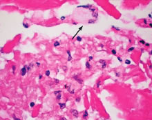 Histopathologically, the lens capsular sacs and vitrectomy material obtained from patients with P. acnes endophthalmitis characteristically show large numbers of gram-positive rods sequestered within the lens capsular sac (Fig. 6). These organisms are usually seen in close association with degenerating lens material.19 Only rarely are mononuclear cells or other inflammatory cells present within the lens capsular sac. However, mononuclear phagocytes, some of which fuse to form giant cells, are commonly present on the external surface of the capsule and within the vitreous gel. These mononuclear cells may show phagocytosed organisms, but only rarely are free bacteria found within the vitreous gel or aqueous.