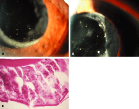 is intact, although it is markedly thinned (Fig. 4A). Some patients with phacolytic glaucoma exhibit conjunctival injection. The large cells present in the anterior chamber are mostly mononuclear phagocytes containing lenticular material. These macrophages accumulate on the lens capsule and clog the trabecular meshwork, thereby causing an elevation in intraocular pressure15 (see Fig. 4B). The diagnosis can be established by paracentesis of anterior chamber fluid and examination of the material for macrophages laden with lens material. The treatment of phacolytic glaucoma consists of reduction of intraocular pressure by acetazolamide and/or hyperosmotic agents, followed by surgical removal of the entire lens. Most patients respond well to this approach, but the patient with angle recession combined with phacolytic glaucoma may require long-term topical or systemic antiglaucoma therapy following extraction of the lens. |
