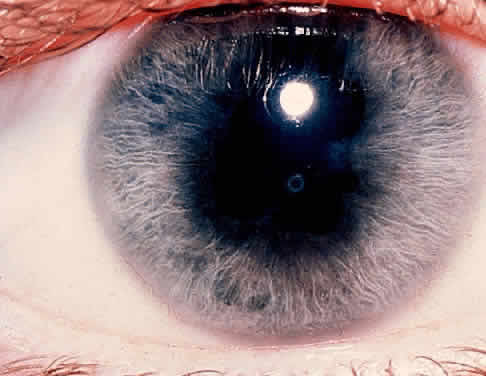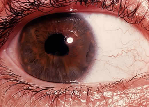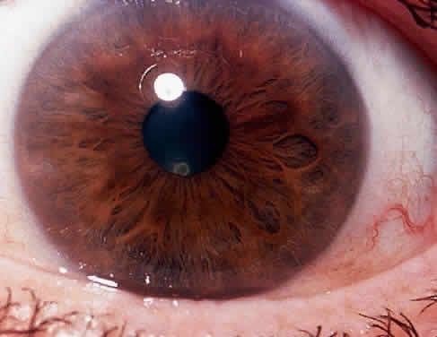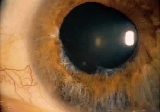 Fig. 5. Involved eye showing iris stromal thinning, peripapillary iris pigment epithelial loss, and alteration in color compared with the normal eye (see Fig. 4).