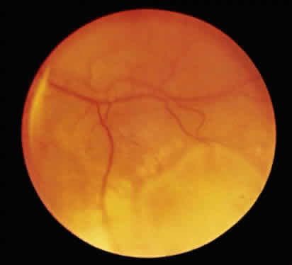 Fig. 11. Serous retinal detachment in patient with scleritis, low-grade chronic iridocyclitis, and rheumatoid arthritis (see Fig. 10).