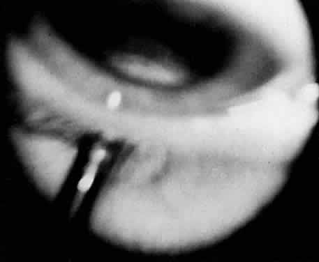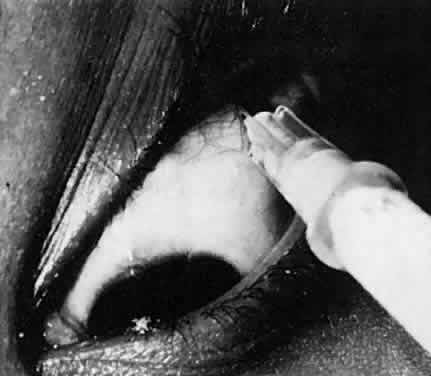 The differential diagnosis includes chronic iridocyclitis and intermediate uveitis secondary to sarcoidosis. The relative paucity of anterior chamber cells and the presence of snowbank in pars planitis distinguish pars planitis from chronic iridocyclitis. Posterior synechiae tend to be larger and more numerous in chronic iridocyclitis than in pars planitis. However, children with pars planitis, younger than 12, frequently have an anterior chamber reaction with severe synechiae and band keratopathy, which are features more characteristic of chronic iridocyclitis than pars planitis. It is unclear whether these severe childhood cases represent true intermediate uveitis or severe chronic iridocyclitis with secondary cyclitic membrane formation. Chronic iridocyclitis and intermediate uveitis secondary to sarcoidosis can resemble pars planitis. Patients with sarcoidosis tend to have more prominent sheathing of the retinal venules and larger mutton-fat-like keratic precipitates. Retinal, choroidal, and optic disc granulomas may form in patients with sarcoidosis. Opacities resembling snowballs or a string of pearls in the inferior peripheral vitreous are more characteristic of sarcoidosis than pars planitis. Unilateral cases of pars planitis must be carefully evaluated for toxoplasmosis and toxocariasis.58 In both of these conditions, areas of inflammation are usually more focal than those in pars planitis. Old chorioretinal scars and vitreous cells emanating from focal areas of retinochoroiditis may be helpful in making the diagnosis of ocular toxoplasmosis. Peripheral retinal granuloma and dragging of the disc by fibrovascular tissue can occur in toxocariasis. A case of intermediate uveitis after cataract surgery has been found to be caused by chronic Propionibacterium acnes endophthalmitis.59 The laboratory evaluation of a patient with pars planitis includes a chest x-ray, analysis of serum lysozyme and angiotensin-converting enzyme levels, and serology for syphilis. When toxoplasmosis or toxocariasis is strongly suggested, appropriate laboratory tests should be ordered. In some patients, pars planitis and MS are present concomitantly. If MS is suspected, neurologic consultation is recommended, and checking for HLA-DR15 may be helpful. Pars planitis has also been reported in patients with Lyme disease.60,61 Infectious disease consultation and appropriate tests should be obtained, especially when there is a history of tick bite in endemic areas for Lyme disease. In the future, the polymerase chain reaction may be performed on aqueous humor or vitreous from eyes with pars planitis to identify possible infectious agents. TREATMENT The mainstay of treatment of pars planitis is corticosteroids. The corticosteroid can be administered topically, orally, periocularly, or intravenously. Topical corticosteroids, such as prednisolone acetate or phosphate, are generally useful in treating the anterior chamber reaction that may be present in some pars planitis patients. Topical corticosteroids, however, are of little use to control the vitreous inflammation or the cystoid macular edema. Topical corticosteroids are generally used as an adjunct in treatment of pars planitis when there is a significant anterior chamber reaction. Cycloplegia may also be necessary to prevent posterior syne-chiae formation. Patients taking topical corticosteroids should be followed regularly, because prolonged use of topical corticosteroids may lead to elevated intraocular pressure and cataract formation. We generally recommend the periocular injection of steroids into the posterior sub-Tenon's space in cases of significant vitreous reaction, cystoid macular edema, or retinal periphlebitis. Posterior sub-Tenon's injection provides the highest concentration of corticosteroids to the most inflamed part of the eye in pars planitis. We generally define visual acuity of 20/40 or less due to vitreous cells and floaters as significant, but obviously significant visual loss must be defined individually. A young pars planitis patient may have a visual acuity of 20/25 with significant clinical cystoid macular edema, whereas an older patient may have a visual acuity of 20/40 with no clinically significant macular edema. The loss of vision in the older patient may be due to permanent macular changes from previous macular edema. We frequently and periodically use fluorescein angiography to monitor the extent of macular edema. If both cataract and cystoid macular edema are present, laser interferometry or potential acuity testing may be useful to assess potentialmacular function. However, these tests frequentlyare overly optimistic in their prediction of im-provement. In giving posterior sub-Tenon's injection, we follow the technique of Nozik,62 in which the corticosteroid is placed adjacent to the sclera posterior to the equator through the superotemporal conjunctival fornix (Fig. 9). We use a 25-gauge needle that is 5/8 long and attached to a tuberculin or 3-mL syringe. Under topical anesthesia, the patient sits in a chair with the back of the head against the headrest. The patient is instructed to look down in the direction of the elbow contralateral to the eye that is to receive the injection. The upper eyelid is lifted with the nondominant hand, and the dominant hand is used to direct the needle. The superotem-poral conjunctival fornix is penetrated with the needle bevel up. After the tip of the needle enters the fornix, the needle is rotated 180 degrees with bevel down. The needle is advanced along the sclera posteriorly slowly with a side-to-side sweeping motion until reaching the hub of the needle, and the injection is then given. When given properly, no medication should be visible anterior to the equator. Careful attention is given to the globe during the advancement of the needle; the movement of the globe should be far less than the sweeping motion of the needle. If there is an exact correspondence between the movements of the gl