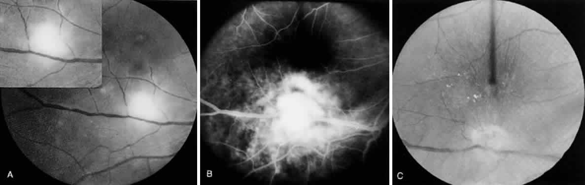 increase in the prevalence of positive antibodies to T. gondii with age.11 Toxoplasma gondii organisms can be transmitted from mothers who are chronically infected with human immunodeficiency virus (HIV) to the fetus, but this is not common. In a small cohort study of HIV-infected women, Minkoff and associates12 did not observe congenital transmission of T. gondii among those with severe immunodeficiency. Congenital toxoplasmosis, therefore, may occur in patients with acquired immunodeficiency syndrome (AIDS) but is not common. The authors observed only one case of congenital toxoplasmosis among 28 HIV-infected female patients.12 A prospective case-control study designed to identify preventable risk factors for T. gondii infection in pregnancy was conducted in Norway.13 Patients were identified through a serologic screening program consisting of 37,000 pregnant woman through sporadic antenatal testing for Toxoplasma infection. Sixty-three pregnant women with serologic evidence of recent primary T. gondii infection and 128 seronegative control women matched by age, expected date of delivery, stage of pregnancy, and geographic area were enrolled. The following risk factors were found to be significant in patients with maternal Toxoplasma infection: (1) eating of raw and undercooked minced meat product (p = 0.007), (2) eating unwashed raw vegetables and fruits (p = 0.03), (3) eating raw or undercooked mutton (p = 0.005), (4) eating raw or undercooked pork (p = 0.03), (5) cleaning the cat litter box (p = 0.02), and (6) washing the kitchen knives infrequently after preparation of raw meat before handling another food item (p = 0.04). In the univaried analysis, traveling to countries outside of Scandinavia was identified as a significant risk factor in acquiring toxoplasmosis.13 In another study on the seropositivity to Toxoplasma among pregnant woman, Ljungstrom and associates14 found 12% to 26% of their subjects to be positive for Toxoplasma antibodies in various urban and rural localities of Sweden. The estimates of the prevalence of toxoplasmosis and risk of maternal infection were strongly dependent on underlying temporal change in the incidence of the disease. Their studies demonstrate the difficulties in interpretation of horizontal cross-sectional data and the need for longitudinal studies of age prevalence and seroconversion in determining the risk factors of maternal toxoplasmosis. Zadik and coworkers15 found 160 (9.9%) of the 1621 women who had experienced seroconversion to be of childbearing age. The rate of seroconversion in the United Kingdom appears to be less than reported. Meenken and colleagues16 found a positive correlation between ocular toxoplasmosis and an increased in the frequency of HLA BW-62 in patients with severe ocular involvement. Toxoplasmosis may be acquired in humans by the following modes of transmission: Ingestion of undercooked infected meat (chicken, mutton, beef, pork) containing Toxoplasma cysts The tachyzoite occasionally may penetrate mucosal surfaces such as the conjunctiva.23 Toxoplasma-infected animals may develop a subclinical infection and live normally but harbor the encysted form (bradyzoite) of the parasite in their muscular system. Undercooked beef, mutton, chicken and pork have been previously incriminated in the transmission of the disease. Ingestion of sporozoites in oocysts may represent a major mode of transmission of the infection in many countries. The presence of infected puppies around homes may allow the accumulation of numerous oocysts. Teutsch and associates22 report an outbreak of toxoplasmosis in which Toxoplasma oocysts were the source of infection and the presumed mode of transmission was by inhalation. Food consumed by humans may be contaminated with the oocysts by insects and cockroaches. Furthermore, accidental contamination of hands while disposing of cat feces may represent another mode of transmission of the disease.13 Allograft transplantation also has been shown to transmit Toxoplasma in humans. The consumption of raw milk also may cause transmission of the disease. An outbreak of toxoplasmosis in Vancouver, British Columbia, involved 110 individuals, including 12 newborns who were infected with T. gondii.24 This is the world's largest recorded outbreak of toxoplasmosis that was found to be caused by a contaminated water supply. If a woman acquires the infection during pregnancy, the disease may be transmitted to the fetus. The prevalence of congenital toxoplasmosis has been estimated to vary between 1:1000 and 1:10,000. This form of transplacental transmission is of great clinical importance. Toxoplasmic infection in consecutive siblings is rare, but congenital ocular toxoplasmosis has been described in siblings. Most acquired toxoplasmosis is asymptomatic. The disease may mimic upper respiratory tract infection and infectious mononucleosis. The mild form of the systemic disease may present as a flulike syndrome and is frequently misdiagnosed as a viral infection. Most of the systemic acquired infections are subclinical, as evidenced by serologic testing of asymptomatic patients. It had been believed that most cases of toxoplasmic retinochoroiditis represented a recrudescence of a congenital disease. Toxoplasmic retinochoroiditis may complicate the course of systemic acquired toxoplasmosis.25–27 I have observed cases of toxoplasmic retinochoroiditis that followed systemic acquired toxoplasmic disease (Fig. 3). Ronday and coworkers28 describe eight cases of unilateral toxoplasmic retinochoroiditis, presumably acquired after toxoplasmosis. Montoya and Remington report 22 adult cases of acute toxoplasmic chorioretinitis that occurred in the setting of acute postnatally acquired toxoplasmosis.29 A patient developed toxoplasmic retinochoroiditis associated with acquired toxoplasmic myocarditis and polymyositis.30 It appears that toxoplasmic retinochoroiditis after acute systemic acquired toxoplasmosis is more common than p