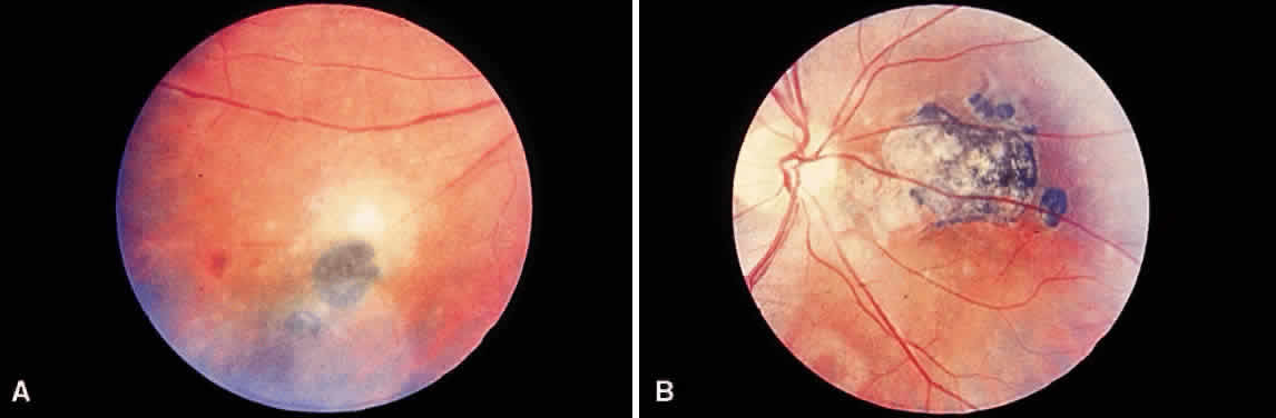 RETINA-CHOROID Ocular toxoplasmosis most commonly presents as a focus of necrotizing retinitis (Fig. 7) involving the inner layers of the retina and associated with a whitish fluffy lesion surrounded by retinal edema.6,59 Cells are seen in the vitreous overlying the lesion. The focus of retinitis may be large (Fig. 8) or small (Fig. 9). The retina is the primary site for the multiplying parasites, whereas the choroid and sclera may be the sites of contiguous inflammation. When the choroid is involved by the inflammatory reaction, the lesion is referred to as retinochoroiditis. The organisms are rarely seen in the choroid. The retinal lesion may be small and single or large and multiple and may reach several disc diameters in size. Large granulomas in the posterior segment of the eye frequently are seen in patients with ocular toxoplasmosis (Fig. 10). This is associated with extensive and marked vitreous reaction that precludes visualization of the retina, and the granuloma appears as a yellowish mass surrounded by a red reflex. Punctate outer retinal involvement may be seen in some patients with toxoplasmosis.60 These appear as multifocal, gray-white lesions in the deep retina and at the level of the retinal pigment epithelium accompanied by no overlying vitreous reactions. The lesions may resolve to form fine, granular white dots. This is the earliest finding seen in the rabbit models of ocular toxoplasmosis after the injection of Toxoplasma organisms in the suprachoroidal space. The lesions in the animal model may start as deep outer retinal punctate lesions that later involve the inner layers of the retina and cause the typical focus of retinochoroiditis. Involvement of the macular area is common in patients with congenital toxoplasmosis, and exudative retinal detachment may occur in severe cases. Clumps of inflammatory cells may be seen in the vitreous or over the detached posterior vitreous face. The focus of retinitis may be a manifestation of congenital toxoplasmosis or may be associated with or follow an episode of acquired systemic toxoplasmosis. Patients presenting with recurrent toxoplasmic retinochoroiditis usually are in the second or third decade, but the disorder may occur at any age. Healing of the retinitis is associated with a decrease in retinal edema and flattening of the lesion with evidence of scar formation surrounded by variable amounts of pigment (Fig. 11). The lesion may appear as a punchedout scar with underlying sclera resulting from extensive retinal and choroidal necrosis surrounded by pigment proliferation (Fig. 12), it may become a conglomerate or proliferated retinal pigment cells (Fig. 13), or it may be small and appear as a pigment clump in the retina. The retinochoroiditic scar may harbor the Toxoplasma cysts. Healing also is associated with decrease in the vitreous cells and improvement in visual acuity. Immunologic suppression is associated with recurrence of retinochoroiditis (Fig. 14). Recurrent toxoplasmic retinitis frequently appears as “satellites” or occurs adjacent to a previous scar. Old, inactive lesions often appear to be a conglomeration of previous multiple inflammatory foci (see Fig. 13).