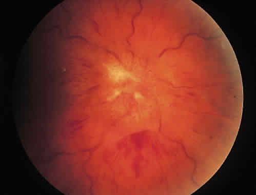 The clinical manifestations of Eales' disease result from three basic pathologic changes: inflammation, ischemia, and neovascularization.38 Vitreous cells are present and anterior segment inflammation is variable. In early stages, venous dilatation and tortuosity are seen in the periphery.37 Accumulation of exudate around peripheral retinal venules appears as thin white lines parallel to the blood column and can obscure the vessel. Areas of vascular sheathing frequently leak fluorescein dye; however, the sheathing does not always correspond to the staining, nor is the amount of leakage proportional to the activity of the inflammation.37 Progression of Eales' disease results in widespread venous occlusion, perivenular or arteriolar exudation, extensive sheathing, and retinal hemorrhage. Involved vessels become obliterated and avascular areas develop in the periphery. The junction between nonperfused and perfused retina is usually sharply demarcated.37 Vascular abnormalities seen at this junction include microaneurysms, venovenous shunts, venous beading, hard exudates, and cotton-wool spots.39,40 Obliteration of peripheral venules and arterioles and branch retinal vein occlusions can be confirmed angiographically.41 Capillary nonperfusion leads to peripheral and disc neovascularization; this is observed in up to 80% of patients with Eales' disease37 and contributes to the development of fibrous proliferation and the risk of retinal detachment. Peripheral neovascularization is more common and is frequently located at the junction between perfused and nonperfused retina. Bleeding from damaged or abnormal vessels may result in vitreous hemorrhage. Extension of nonperfusion into the posterior pole may result in decreased visual acuity due to macular edema or epiretinal membrane or macular hole formation. Some patients develop anterior uveitis, cataracts, rubeosis iridis, secondary neovascular glaucoma, and optic atrophy in the late stages of the disease.37 There is histopathologic evidence of lymphocytic and granulomatous infiltration of vessel walls and lumina, and perivascular spaces.42 The cause of Eales' disease, however, is unknown. It may represent a hypersensitivity reaction to tuberculoprotein. This hypothesis stems from isolated reports of vasculitis after skin testing or BCG vaccine and the prevalence of positive purified protein derivative testing in patients with the disease.43 Tubercles in the venous walls were also reported in the older literature.44 One study found elevated IgA and IgG levels in patients with Eales' disease,45 whereas other studies showed no immunoglobulin abnormality.46,47 Abnormal levels of circulating immune complexes have also been reported.48 Eales' disease probably has more than one cause. IDIOPATHIC RETINAL VASCULITIS Retinal vasculitis occurring in isolation, with no systemic association, has been referred to as idiopathic retinal vasculitis.49 Typical findings include inflammatory cells in the vitreous and sheathing of retinal veins and postcapillary venules. Fluorescein angiography may show diffuse capillary leakage.50 Idiopathic retinal vasculitis can be classified into ischemic and nonischemic forms. Patients with ischemic retinal vasculitis have a worse visual outcome despite aggressive systemic treatment than those with nonischemic retinal vasculitis.49 A few patients with idiopathic retinal vasculitis have disseminated central nervous system lesions characteristic of multiple sclerosis.50 Lyme disease and cat scratch disease (Bartonella henselae) have been anecdotally associated with retinal vasculitis.51–53 OPTIC DISC VASCULITIS Optic disc vasculitis (papillophlebitis) is a unilateral, idiopathic, usually benign condition that primarily affects healthy adults younger than 40.54 The only symptom is blurred vision. Retinal findings include edema of the optic disc and adjacent retina, markedly dilated and tortuous retinal veins with minimal arterial involvement, and a variable amount of retinal hemorrhage (Fig. 7). Other findings include venous sheathing, retinociliary shunt vessels, and depigmentation of the macular area.55 Vitreous cells are absent or scant. Fluorescein angiography findings may include delayed venous filling, marked retinal venous dilatation, and massive dye leakage from the optic nerve head and large retinal veins.54 Hayreh divided the disease into two types: type 1, with optic disc edema and good visual outcome as the dominant features, and type 2, with a clinical picture similar to central retinal vein occlusion.54 In the second type, the visual outcome depends on the site and extent of the lesion. Hayreh suggested that type 1 is due to a mild nonspecific vasculitis of the ciliary vessels, whereas type 2 is probably due to phlebitis of the central retinal vein within the optic nerve head or retrolaminar region.54 Papillophlebitis is self-limited, lasting 6 to 18 months, and the visual acuity is seldom severely decreased. Unlike peripheral retinal vasculitis (Eales' disease), optic disc vasculitis is rarely recurrent or associated with vitreous hemorrhage. No therapy is necessary, although corticosteroids have been reported to shorten the course. There is controversy over the existence of papillophlebitis, and some believe it represents a mild central retinal vein occlusion in a young person.56 INTERMEDIATE UVEITIS Intermediate uveitis is a syndrome with a noninflamed external eye, low-grade anterior segment reaction without synechia formation, and vitreous inflammation. Mild periphlebitis and optic disc and macular edema may also occur. Intermediate uveitis includes “pars planitis” and conditions that have been previously called chronic cyclitis, vitritis, and peripheral uveitis. This syndrome has been associated with several systemic diseases, including multiple sclerosis, Whipple's disease, and reticulum cell sarcoma.57 Pars planitis is associated with the HLA-DR2 antigen and the temporal development of multiple scleros