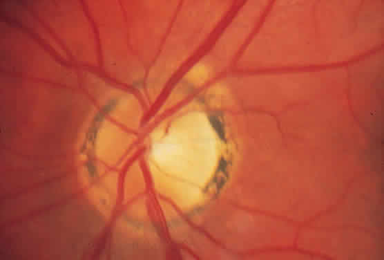 PERIPAPILLARY ATROPHY A ring of peripapillary atrophy (Fig. 3) occurs in the majority of cases of POHS. This ring is characteristic, with a narrow inner pigment zone adjacent to the disc edge and a white depigmented zone away from the disc. It is hypothesized that a circle of granulomas forms during the active infective stage of the disease and that these granulomas atrophy, leaving the ring of peripapillary atrophy. Neovascular membranes can occur in these rings of atrophy and sometimes involve the macula.25