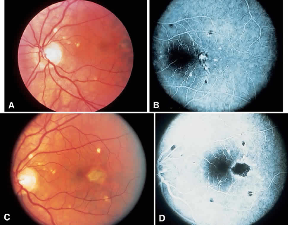 eventually deteriorate to a visual acuity of 20/200 or worse. In a study by Watzke and Claussen,23 16.6% of eyes developed new infiltrates in the choroid and retina in areas that were clinically and angiographically normal 10 years previously. The basic lesion was found to be a nodular choroidal infiltrate that evolved clinically and angiographically from normal retina. Angiographically, the lesion was initially hypofluorescent with the later hyperfluorescence of a choroidal scar. |