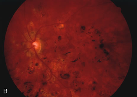 HISTORY AND CLASSIC FINDINGS Presumed ocular histoplasmosis (POH) is probably caused by dissemination of the histoplasma capsulotum after acute exposure to the organism. It is characterized by punched-out chorioretinal lesions, peripapillary scarring, and choroidal neovascular membranes, with no vitreous or anterior chamber inflammation. This disease is seen most often in people who come from the Ohio-Mississippi River Valley area where the fungus is ubiquitously found. Most often patients present in their fourth and fifth decade of life because of the development of a choroidal neovascular membrane. There may be a genetic predisposition and patients that have the HLA-B7 or the HLA-DR2 haplotype may be more susceptible to developing the ocular form of the disease. It is hypothesized that after acute exposure to the organisms by inhalation in susceptible persons, there may be a pulmonary infection associated with symptoms of a lower respiratory tract infection including mild fever and a cough. This elicits a granulomatous response and the organisms are probably destroyed by this cell-mediated response. As opposed to the inflammatory choroiditides, POH tends to be asymptomatic unless there is a choroidal neovascular membrane that is causing visual symptoms. There have been a few cases reported that appear to show that there can be symptomatic exacerbations of the inflammatory component of the choroidal scars. These cases are rare and they appear to respond to corticosteroids. There are also rare cases of intrascar neovascularization that may imitate the exacerbation of inflammation. It is hard to distinguish intrascar neovascularization from a true exacerbation of inflammation because they both show subretinal fluid, the patient is symptomatic in both, and the lesions respond to corticosteroids many times in both cases or at least temporarily in cases of intrascar neovascularization. If there is subretinal hemorrhage, the cause of the symptoms is neovascularization. Once the neovascularization extends to the edge of the scar, then laser photocoagulation or photodynamic therapy should be considered. These intrascar neovascularizations are different from classic cases where the neovascularization begins at the edge of the scar.39 BIOMICROSCOPY Rarely, there are some cases of documented choroiditis associated with histoplasmosis. There are however rare cases and if there is choroiditis, other diagnoses, especially multifocal choroiditis, should be considered. |