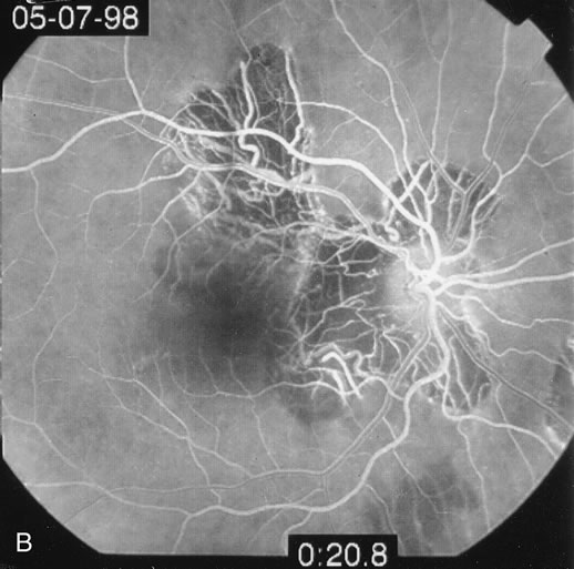 SYSTEMIC ASSOCIATIONS OF ACUTE POSTERIOR MULTIFOCAL PLACOID PIGMENT EPITHELIOPATHY There have been multiple reports of a cerebral vasculitis in association with APMPPE. These patients may have a cerebral spinal fluid pleocytosis. In patients with APMPPE who complain of headaches or have other central nervous system findings, magnetic resonance imaging should be strongly considered and the patient should be placed on high doses of corticosteroids. The interval between the APMPPE and the onset of symptomatic cerebral vasculitis may be up to 3 months. Mumps have been associated with APMPPE as well as immunization with hepatitis B virus vaccine. In the case of the immunizations, the APMPPE occurred after the booster injection. There has been a case of APMPPE after streptococcal infection.34 ANCILLARY TESTING Fluorescein The classic findings in the acute cases are lesions of variable size that are hypofluorescent in the early phase of the fluorescein angiogram. In the late phases of the angiogram there is hyperfluorescence of the lesions. In the late phases, there also may be leakage from the disc as well, and there also may be staining of the retinal vessels because of the vasculitis. With resolution of the disease, there still may be a mottled pattern of fluorescence correlating with the areas of pigment clumping and pigment atrophy (Fig. 8). Indocyanine Green ICG angiography shows an absence of fluorescence in the early as well as in the late phases of the angiogram. This is consistent with the possibility that the disease is caused by a choroidal occlusive vasculitis. There may be more lesions than seen ophthalmoscopically or by fluorescein angiography. In addition, there may be the development of new lesions in the first few weeks that can be seen by indocyanine green that cannot be seen by fundoscopy.35 This appears to imply that the disease is first a choroidal vasculitis, and in the more severe cases it can then affect the overlying retinal pigment epithelium and outer retina. Other Diagnostic Findings The electroretinogram and electrooculography may both be reduced in APMPPE. There may also be a prolonged dark-adaptation, color match abnormalities, and an abnormal Stiles-Crawford effect. These abnormalities resolve after 1 year. By fundus reflection densitometry, there is decreased cone pigment in the acute phase and pigment regeneration is prolonged; these findings also resolve with time.36,37 Laboratory Tests/Immune Testing The HLA B7 and the HLA DR2 haplotype were seen more often in patients with APMPPE in one report, but that has not been confirmed. Differential Diagnosis/Mimics Although the differential diagnosis includes all other white dot syndromes, the most common diseases that closely resemble APMPPE are serpiginous choroiditis, MEWDS, birdshot choroidopathy, diffuse metastatic cancerous lesions, non-Hodgkin's lymphoma, and Pneumocystis choroiditis. Subacute sclerosing panencephalitis caused by chronic measles infection can have similar fundus findings. If the patient is older than the normal group of patients, if the lesions are not exactly typical, or if there are systemic findings, then a complete systemic work-up should be considered. Serpiginous choroiditis is associated with recurrences that are rare or probably do not occur with APMPPE. In addition, multiple separate lesions are rare in serpiginous choroiditis but common in APMPPE. By contrast, choroidal neovascularization is rare in APMPPE but common in serpiginous choroiditis. Both tend to be bilateral but there is asymmetry in the time course of the lesions in serpiginous choroiditis whereas in APMPPE the lesions of both eyes tend to follow a similar time course. Finally, patients with serpiginous choroiditis tend to be middle-aged compared to young adults in APMPPE. Natural History Usually, the lesions resolve leaving only mild pigment mottling and the vision also improves. Resolution begins after a few weeks and may continue for up to 1 year. Choroidal neovascularization may occur with APMPPE but is a rare finding. Sometimes there may be significant pigment changes and even mild chorioretinal scarring. In cases where the pigmentary changes are under the fovea, visual improvement may be limited. In one series, 11% had visual acuity of 20/200 or worse on follow-up, although another series had 94% of affected eyes having a final visual acuity of 20/30 or better.38 Usually if there is marked chorioretinal scarring, serpiginous choroidopathy should be considered a possible diagnosis. Treatment and History with Treatment Treatment is only indicated in cases with concomitant cerebral vasculitis or in cases where the vision is markedly diminished. Corticosteroids are used in those cases. It is not certain that corticosteroids affect the visual outcome but it appears to affect the course of the cerebral vasculitis. In cases where the cerebral vasculitis does not appear to improve or in cases where there is marked bilateral visual loss that is unresponsive to corticosteroids, consideration for using cyclosporine should be given. |