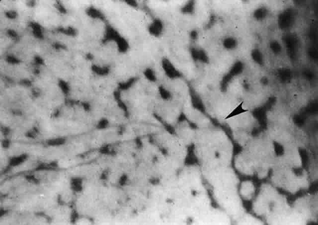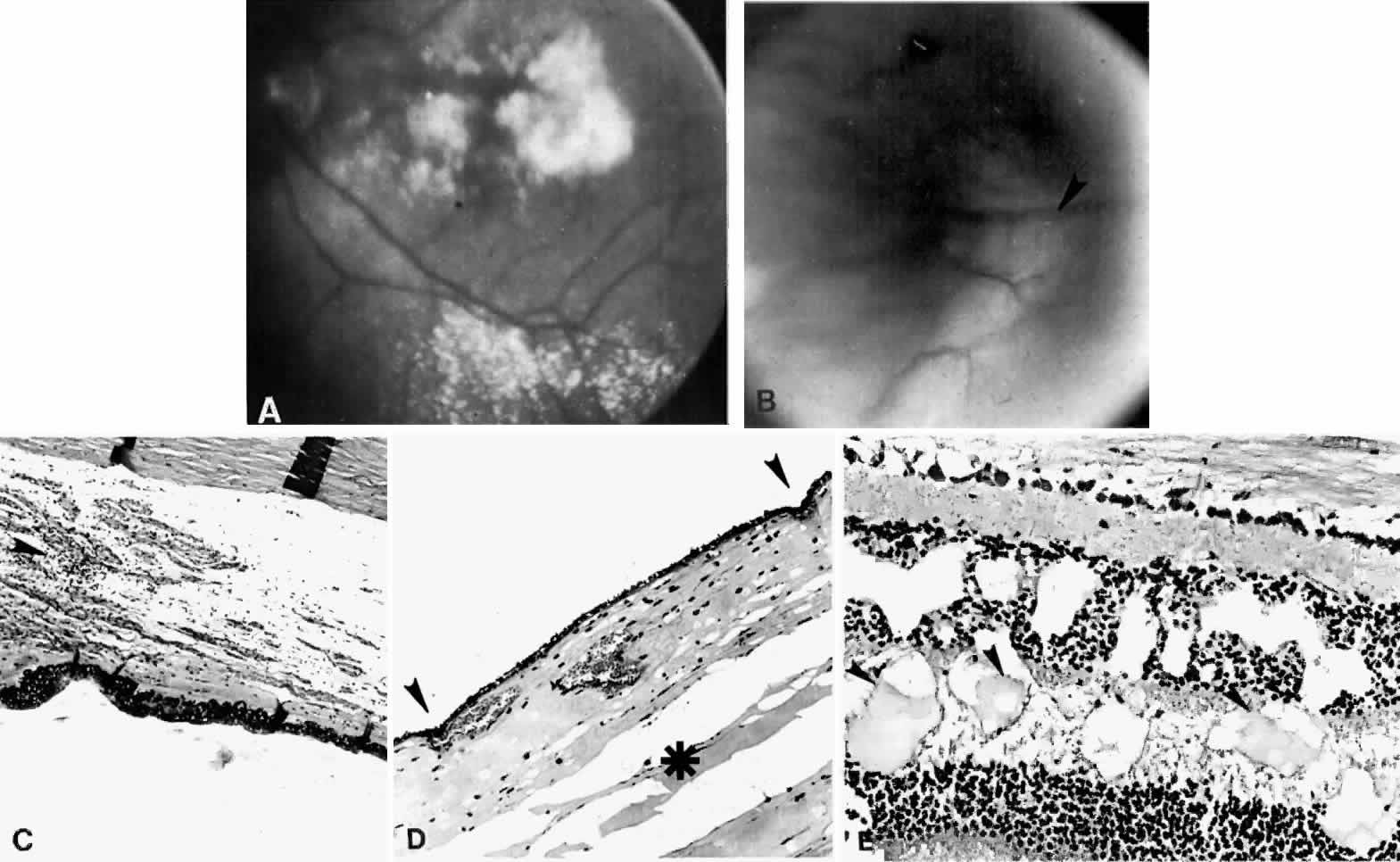 Although a ciliochoroidal effusion is usually associated with low intraocular pressure, it may sometimes result in anterior rotation of the ciliary body, secondary angle-closure glaucoma, and elevated intraocular pressure in some cases.12–20 A ciliochoroidal effusion presenting as secondary angle-closure glaucoma has been reported in several patients with acquired immunodeficiency syndrome (AIDS).16–18 The etiologic and pathophysiologic mechanisms of ciliochoroidal effusion formation in HIV-positive patients have not yet been elucidated. In a chronic ciliochoroidal effusion, breakdown of the blood-ocular barrier at the level of the retinal pigment epithelium (RPE) may occur, leading to a nonrhegmatogenous retinal detachment characterized by shifting subretinal fluid. The protein content of this fluid may be more than three times greater than that of plasma, causing it to shift to a dependent position as the eye and head move.21 The amount of subretinal fluid increases as the chronicity of the effusion increases. A total retinal detachment may result, making the detection of shifting fluid difficult. Linear areas of RPE hypertrophy and hyperplasia may also be observed in chronic effusions (Fig. 3). These streaks, noted by Verhoeff,22 suggest a chronic and recurrent process.