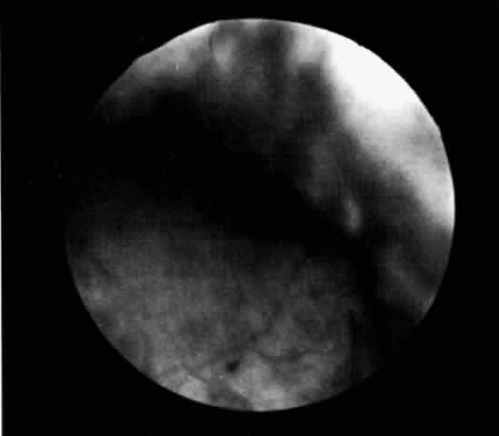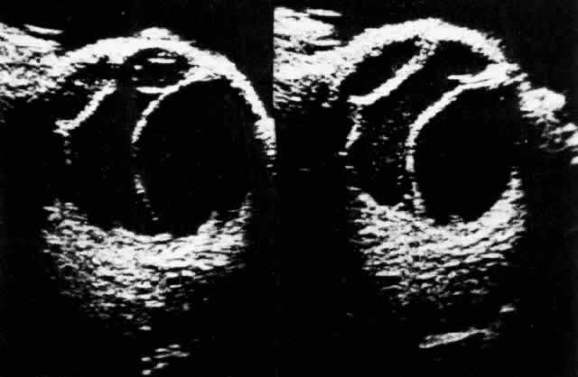 a multilobed uveal melanoma that was not appreciated preoperatively. A ciliochoroidal effusion and other benign processes may be accurately differentiated from choroidal tumors with B-scan ultrasonography, as reported by Coleman29 in more than 60% of cases. Ultrasonography can distinguish a ciliochoroidal effusion from a retinal detachment by the acute anterior angle of the acoustic shadow of an effusion and its extension anterior to the ora serrata (Fig. 6). The ultrasonic finding of a diffusely thickened choroid posteriorly should alert the ultrasonographer and ophthalmologist to the possibility of a ciliochoroidal detachment more anteriorly. If posterior choroidal thickening is not associated with a peripheral ciliochoroidal detachment, other clinical entities should be excluded, such as posterior scleritis, choroidal inflammation, and intraocular tumors.30 Scleral infolding may ophthalmoscopically simulate a ciliochoroidal effusion in a hypotonous eye, and B-scan ultrasonography may assist in the diagnosis.31 These adjunctive tests can also differentiate a serous from a hemorrhagic ciliochoroidal effusion. In a serous ciliochoroidal effusion, fluorescein angiography demonstrates characteristic background fluorescence, RPE abnormalities, and leakage from the large choroidal vessels, whereas a hemorrhagic ciliochoroidal effusion blocks these angiographic patterns.12,32 Peyman and co-workers31 demonstrated the usefulness of computed tomography in differentiating a serous effusion from a hemorrhagic choroidal detachment. |