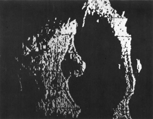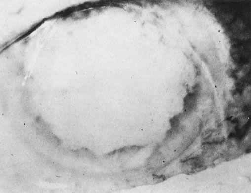 Unfortunately, imaging studies are not always diagnostic. The A- and B-scans shown in Figures 3 and 4 were from a patient with unilateral media opacity referred for evaluation and treatment of a presumed uveal melanoma. Occasionally, if the cataractous lens is scanned tangentially, artifact can occur. A repeat ultrasound at our institution was negative for tumor, and the referral ophthalmologist who performed a cataract extraction noted that no tumor was present and that the patient has an excellent visual outcome. In contrast, the patient shown in Figure 5 was referred with a presumed uveal melanoma with secondary inflammation and a history similar to that described for the patient shown in Figure 111 Ultrasound and CT examinations were not diagnostic. Because the eye was blind and painful, it was enucleated, and an extremely necrotic uveal melanoma was noted histologically. In some necrotic melanomas, the fundus cannot be visualized and the diagnosis cannot be established with imaging studies. Very rarely, a necrotic uveal melanoma can produce sufficient pigment dispersion into the vitreous to obscure the correct diagnosis.12