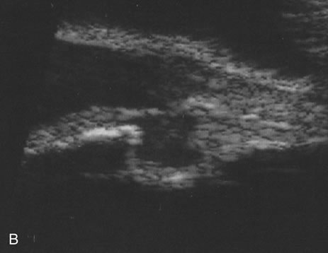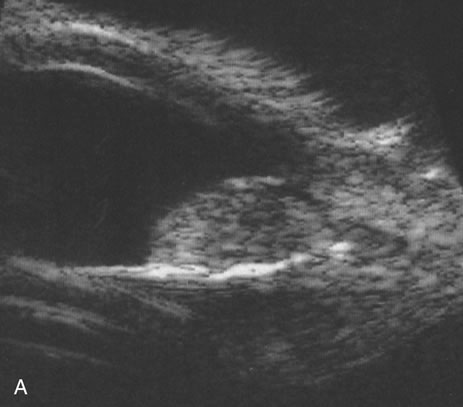 Iris melanomas can produce anterior chamber cell and flare, and if the tumor is located in the extreme iris periphery, it may be missed during a cursory examination. Iris melanomas, especially those in a circumferential or ring configuration, are often difficult to diagnose and may simulate either an anterior uveitis or glaucoma.16 Newer, higher-megahertz (high-frequency) ultrasound equipment is better for imaging anterior uveal tumors (Fig. 7). If direct ophthalmoscopy is used, a circumferential peripapillary melanoma can simulate optic neuritis (Fig. 8).