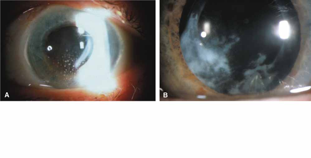 Vitreous biopsy and anterior chamber paracentesis may show the presence of polymorphonuclear leukocytes, histiocytes, and plasma cells surrounding amorphous lens material.141 Concomitant inflammation of the retina and choroid has been reported in 76% and 51% of cases, respectively.126 Diagnosis The diagnosis of phacoantigenic uveitis can be suspected or made presumptively in cases of postoperative or posttraumatic granulomatous inflammation with concomitant disruption of the lens capsule. A definitive diagnosis of phacoantigenic uveitis requires vitreal biopsy or anterior chamber paracentesis, which may yield macrophages that show engorged cytoplasm, presumably filled with lens material. Of 144 histopathologically reviewed cases of phacoantigenic uveitis that Marak141 reported, only six (5%) were correctly diagnosed clinically. Since clinical diagnosis of phacoantigenic uveitis is difficult, in suspected cases anterior chamber fine needle biopsy and its cytopathology is reported to be a valuable adjunct to clinical examination. Differential Diagnosis Phacoantigenic uveitis should be differentiated from other forms of postoperative uveitides, including sympathetic ophthalmia, delayed infectious endophthalmitis, toxic reactions due to foreign material introduced at surgery, and those associated with intraocular lens (such as mechanical disturbances, manufacturing problems, etc.).138 Sympathetic ophthalmia (SO) is, by definition, bilateral and, in one-third of cases, characterized by the presence of Dalen-Fuchs nodules, whereas phacoantigenic uveitis is usually unilateral and is not characterized by fundus lesions. Although phacoantigenic uveitis may be bilateral at times, the inflammation is usually simultaneously active in sympathetic ophthalmia. Choroidal thickening is observed in SO on ultrasound, and there is minimal choroidal inflammation in phacoantigenic uveitis. Sympathetic ophthalmia can, however, coexist with phacoantigenic uveitis. Delayed infectious endophthalmitis after intraocular surgery and trauma may mimic phacoantigenic uveitis. One of the primary examples is Propionibacterium acnes endophthalmitis, which usually presents as chronic granulomatous uveitis and may be difficult to distinguish from phacoantigenic uveitis. Like phacoantigenic uveitis, P. acnes endophthalmitis typically occurs after uneventful extracapsular cataract extraction and is characterized by mutton-fat keratic precipitates, anterior chamber reaction, and vitreous cells. The presence of plaque-like material on the capsular bag may be a helpful feature in distinguishing P. acnes endophthalmitis from phacoantigenic uveitis (Fig. 4). The diagnosis of P. acnes endophthalmitis is usually confirmed by positive cultures of the aqueous humor or the vitreous. Like sympathetic ophthalmia, P. acnes endophthalmitis may be associated with phacoantigenic uveitis.142 Other causes of delayed infectious endophthalmitis include coagulase-negative Staphylococcus and corynebacterium.143–146 Various fungi, particularly Candida species, can produce a similar picture.143,144,146,147 In cases of phacoantigenic uveitis with elevated intraocular pressure, phacolytic glaucomas should be considered in the differential diagnosis. In phacolytic glaucoma, the lens is usually hypermature and the elevation of intraocular pressure is the result of blockage of trabecular meshwork by macrophages with ingested lens material.148 The treatment of phacolytic glaucoma is removal of the cataract. Pathogenesis The exact pathogenesis of phacoantigenic uveitis is unknown. It has been suggested for years that phacoantigenic uveitis is an immune rejection of a sequestered foreign material that is released as a result of lens injury.149 However, embryonic lens material is surrounded by the vascular plexus-tunica vasculosa lentis, and lens tissue is well recognized by the immune system. The large number of extracapsular cataract extractions performed annually and the rarity of phacoantigenic uveitis also do not favor this hypothesis. An alternative hypothesis suggests that phacoantigenic uveitis represents a loss of tolerance of the immune system to lens antigens. T-cell tolerance is normally maintained by small amounts of circulating lens protein. This tolerance may be altered by trauma and infection.138 Genetic predisposition may also play a role. Phacoantigenic uveitis seems to be an immune complex disease (type III hypersensitivity reaction). The amount of inflammation in phacoantigenic uveitis does not depend upon the amount of lens material that remains in the eye.150 The degree of inflammation has, however, been correlated with antibody titer.151 De novo production of antilens antibodies has been reported after extracapsular cataract extraction, and these antilens antibodies can cross-react with uveal antigen.151 In experimental phacoantigenic uveitis induced in rats, Rao et al.152 showed that oxygen radicals, such as hydrogen peroxide and hydroxyl radicals, play an important role. Treatment The mainstay of treatment of phacoantigenic uveitis is removal of all the remnant lens material (including cortical material and nuclear fragments) in the eye. Removal of the capsular remnants and the intraocular lens is also recommended.122,124 Use of chymotrypsin, which breaks down zonules, may facilitate the complete removal of the residual capsular remnant. Topical, periocular, and systemic corticosteroids may be used as adjuncts to surgical intervention to minimize the intraocular inflammation. Antiglaucomatous medications may be necessary in cases of phacoantigenic uveitis with concomitant elevation of intraocular pressure. Some mild cases of suspected phacoantigenic uveitis occurring after cataract surgery seem to go into remission spontaneously after several weeks. It is possible that exposed antigen is eliminated or sequestered by the body such that inflammation stops. In many of these cases, retained lens material is still visible on slit lamp e