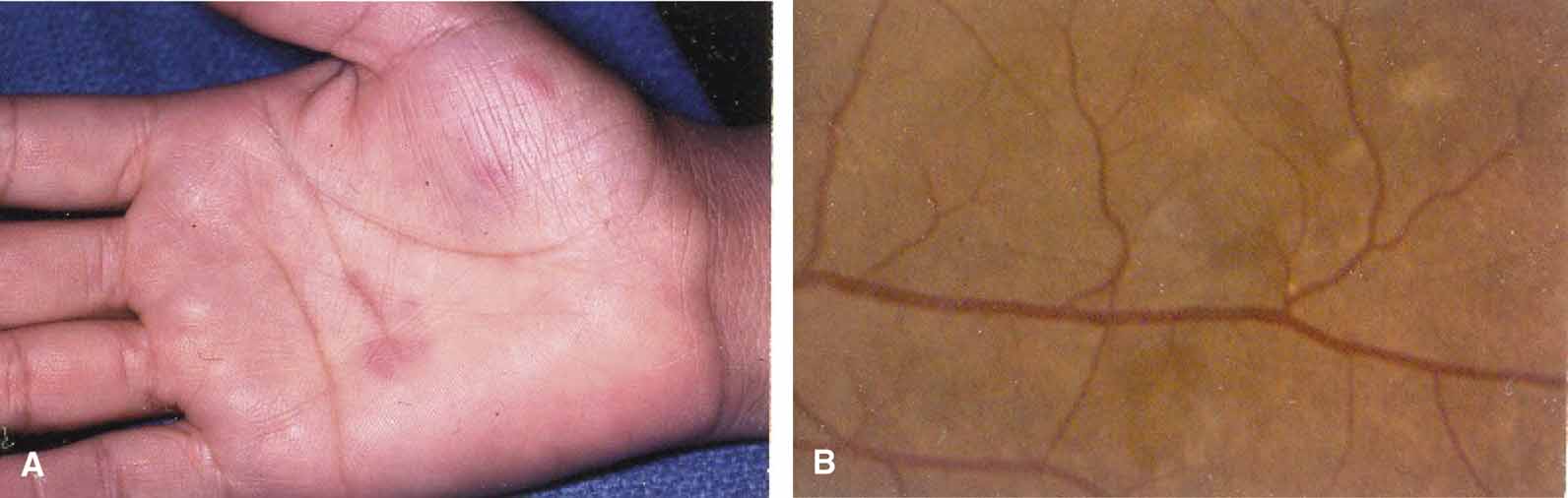 manifestations of LCCV are rare. The kidneys, joints, lungs, brain, and gastrointestinal tract may be involved, resulting in gastrointestinal symptoms (e.g., nausea, vomiting, diarrhea, and constipation), arthralgia, hematuria, and glomerulonephritis. Pathologically, the vasculitis involves the postcapillary venules in a majority of cases; however, the arterioles may also be involved. Leukocytoclastic vasculitis often occurs in patients with connective tissue diseases (e.g., systemic lupus erythematosus and rheumatoid arthritis). Circulating immune complexes are believed to be important in the pathogenesis of leukocytoclastic vasculitis. Tsai et al.174 described a case of panuveitis and multifocal retinitis in a patient with LCCV. Autoimmune keratolysis secondary to cutaneous LCCV has also been described.175 The development of LCCV has been reported after the use of the TNF antagonist etanercept.75 We, too, have seen a patient with LCCV who developed chronic iridocyclitis and retinal vasculitis (Fig. 5). As in the case reported by Tsai et al.,174 the diagnosis in our patient was confirmed through skin biopsy; and in both cases the patients were treated with systemic corticosteroids.