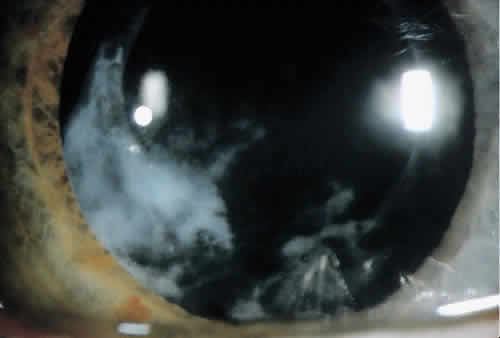 Diagnosis As in cases of acute postoperative endophthalmitis, aqueous and vitreous cultures should be obtained. Owens and coworkers suggest directing the anterior chamber tap needle into the capsular bag or toward the plaque to increase pathogen yield.117 Likewise, it is desirable to acquire a section of the capsule or plaque when attempting to obtain a vitreous specimen.91,92 This should be sent for culture as well as histopathologic studies.92,110 Specimens should then be sent for both Gram stain and culture, including culture on anaerobic media. The specimens must be incubated for at least 1 to 2 weeks because it may take longer than expected to observe growth.92 As in cases of acute infectious endophthalmitis, PCR may be helpful in establishing a diagnosis.47,48 Treatment No consensus exists regarding the best treatment for patients with chronic infectious postoperative endophthalmitis. Various treatment strategies have been suggested but the individual patient must be kept in mind when deciding on a therapeutic plan. Some authors have suggested that initial treatment should consist of medical therapy such as topical and systemic antibiotics alone, or in combination with intraocular antibiotics.93,102,111 P. acnes has been shown to be sensitive to penicillins and cephalosporins, but vancomycin may be the intraocular antibiotic of choice.91,92,111 Vancomycin is not only effective against P. acnes, but provides coverage against other bacteria such as coagulase-negative streptococcus, which can cause delayed-onset endophthalmitis.51,91 Other antibiotics such as clindamycin and chloramphenicol can also be effective.91,117 Zambrano and coworkers reported successful treatment using a nonsurgical approach consisting of topical, intraocular and/or intravenous antibiotics in four of nine cases reviewed at Bascom Palmer Eye Institute.102 Clindamycin irrigation into the capsular bag has also been reported to be useful in treating P. acnes delayed-onset endophthalmitis,117,118 although another series reported recurrent inflammation in 100% of patients receiving intraocular antibiotic treatment alone.111 Most cases will go on to require some type of surgical treatment due to recurrent or persistent inflammation. Zambrano and colleagues proposed an algorithm to treat patients with delayed-onset infectious postoperative endophthalmitis.102 They suggested that patients who present with mild symptoms on initial examination have cultures performed and be given intraocular vancomycin. If that therapy is ineffective, those authors suggest that PPV with excision of the intracapsular plaque and repeat antibiotic injection be completed while maintaining sufficient capsule to support the IOL. Patients presenting with more severe clinical findings may receive this treatment initially. Finally, if this approach does not alleviate inflammation, IOL removal with complete capsular bag removal and possible IOL exchange can be performed.102 Clark and colleagues111 found that patients treated with intra-ocular antibiotics alone or a combined therapy with PPV and intraocular antibiotics had high rates of recurrent and persistent inflammation (100% and 50%, respectively.) Patients receiving PPV with subtotal capsulectomy and intraocular antibiotics had a 14% incidence of inflammation following treatment. No recurrent or persistent inflammation was reported for those patients who later went on to receive PPV, total capsular bag removal, intraocular antibiotics, and either IOL exchange or removal.111 Despite various available treatment options and the lack of ideal therapeutic alternatives, the visual prognosis for these patients can be relatively good.93,102,111,119 Clark and colleagues reported final visual acuities to be 20/40 or better in 50% of patients and 20/400 or better in 75%.111 Zambrano and coworkers reported final visual acuities for two thirds of patients to be between 20/20 and 20/60 and Winward and coworkers reported final visual acuity of 20/70 or better in 70% of patients.93,102 Poor final visual acuity is often attributed to cystoid macular edema, retinal detachment, retinal vascular events, glaucoma, or phthisis bulbi.92,102,111 FUNGAL ENDOPHTHALMITIS The first case of fungal endophthalmitis was reported by Romer in 1902 following a case of penetrating trauma with subsequent Aspergillus fumigatus infection.120 Fungal endophthalmitis is usually considered in the differential diagnosis of indolent postoperative inflammation, although reports of acute postoperative fungal endophthalmitis have also been cited.105,106,121 Fungal infections are relatively rare and can resemble bacterial endophthalmitis, making diagnosis difficult.105,114 When this diagnosis is being entertained, diagnostic measures should be completed expeditiously because a delayed diagnosis may be associated with a poorer visual prognosis.106 Clinical Features Some clinical signs may help distinguish fungal endophthalmitis from other sources of infection. Fungal infections may exhibit “fluff balls” or a “string-of-pearls” infiltrate in the anterior chamber and vitreous.91,101,122,123 The infection tends to be more localized with inflammation often limited to the anterior chamber, pupillary space, or anterior vitreous,105,123 and a mass may be seen on the iris, ciliary body, lens, or adherent to the cornea105,106,124 (Fig. 3). Reports have demonstrated that fungus can infiltrate these ocular tissues, which serve as a reservoir for persistent infection.105 Other findings can include persistent corneal edema, corneal infiltrates or necrotizing scleritis.91,110,111,125 As in chronic bacterial endophthalmitis, a hypopyon or white plaque may be seen, and low-grade persistent and recurrent inflammation is often noted.91,101,106,121,122 Various organisms have been reported to cause postoperative fungal endophthalmitis. These include Candida parapsilosis, Aspergillus flavus, Torulopsis candida, Torulopsis magnoliae, Paecilomyces lilacinu