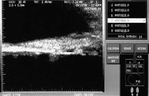 Angiographic CME must be differentiated from clinical CME, the former representing patients with evidence of CME on fluorescein angiogram, but no visual disturbance, and the latter associated with reduced vision.191 Many patients demonstrate angiographic evidence of CME following uneventful cataract surgery, but most have no biomicroscopic evidence of CME and no decreased visual acuity.193,195 According to Gass, up to 70% of patients may have had angiographic CME following ICCE, with fewer than 10% having clinical CME.195 One prospective study reported the incidence of clinical CME to be 1.7% 6 months following ECCE with posterior chamber IOL.199 IOL implantation at the time of surgery does not seem to influence the incidence of postoperative CME.193 The incidence of postoperative CME has decreased with the movement from ICCE to ECCE and phacoemulsifications.193,200 Intracapsular surgery has a significantly higher rate of postoperative CME than extracapsular surgery, and extracapsular cases complicated by vitreous loss have a significantly higher rate of CME than uncomplicated ECCE cases.193,200 The incidence of CME is also greater in patients with iris prolapse, vitreous adhesion to the wound, diabetic retinopathy, and significant postoperative inflammation.195,201 Clinically significant CME typically presents within 4 to 12 weeks after surgery.195 Patients complain of blurred central vision, which is generally reduced to the range of 20/30 to 20/70.195 Visual symptoms may fluctuate and may not correlate with findings on fluorescein angiogram.191 Circumlimbal injection along with anterior chamber cell and flare and vitreous cells may be noted.195,196 Evidence of intraoperative complications such as posterior capsule rupture and vitreous adhesion to anterior chamber structures may be seen. Fundus examination may reveal foveal granularity and intraretinal cystoid spaces may be demarcated. Alternately, the fundus may appear normal. For cases in which biomicroscopic evidence of CME is not evident, fluorescein angiography is helpful for diagnosis. The practitioner must remember that CME may result from other unrecognized disorders present before cataract extraction or developing after surgery such as diabetic retinopathy, vein occlusions, hypertensive retinopathy, and retinal detachment.190,194,197,202 Most cases of postoperative CME resolve spontaneously without treatment, making it difficult to evaluate the effect of therapeutic agents. Various pharmacologic treatment modalities have been used to treat chronic postoperative CME including topical, periocular, and systemic steroids, topical nonsteroidal antiinflammatory agents, and systemic carbonic anhydrase inhibitors. Only topical ketorolac tromethamine 0.5% has been shown to significantly improve visual acuity in prospective randomized studies.203,204 For eyes in which chronic postoperative CME persists despite medical therapy, the Vitrectomy-Aphakic Cystoid Macular Edema Study Group demonstrated that statistically significant improvement in visual acuity could be achieved after vitrectomy.205 Others investigators have found similar results.200,206 Nd:YAG lasers have also been used to interrupt vitreous strands adherent to the iris or wound.207,208 |