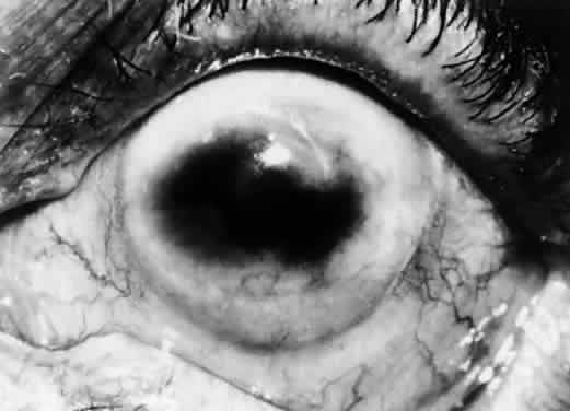 TB are lacking. The mechanisms of ocular and adnexal involvement include active infection and immunogenic disease. Active infection can occur as a primary ocular infection caused by introduction into the eye by contaminated hands or fomites, or exposure to dust or sputum particles laden with bacilli.37 More commonly, active ocular or adnexal infections occur secondarily by hematogenous spread of tubercle bacilli from a distant site of active primary or secondary stage systemic disease or by contiguous spread (e.g., nasal sinuses, meninges). The result is granuloma (tubercle) formation that can involve any part of the eye, orbit, or visual pathways. EYELIDS Primary infection of the eyelid is characterized by ulceration and lymphadenopathy. However, lid involvement usually occurs as lupus vulgaris, a slowly progressive, chronic process without regional lymphadenopathy, which begins as a small tubercle under the epithelium. The nodule becomes more superficial in location, varying in size from pinpoint to pea-sized, with surrounding erythema.38 The nodules increase in numbers, forming a lupus-patch. Large areas can become involved and result in severe cicatrization, causing ectropion and corneal exposure. ORBIT Orbital involvement can include cellulitis, periostitis, osteomyelitis abscess formation, and chronic dacryoadenitis. Tuberculous orbital involvement may displace the globe, cause irregular destruction of the orbital walls, and induce hyperostosis.39 These lesions usually are of metastatic origin. Fistula formation can occur.40 Dacryocystitis can be primary or secondary to adjacent osseous TB. CONJUNCTIVA Tuberculosis of the conjunctiva is very rare. Infection can be primary, in which the source is exogenous (e.g., airborne particles, trauma). Secondary infection can be endogenous via the bloodstream or by direct extension from an adjacent focus. Bulbar conjunctival nodules in a patient with a history of TB should make one suspicious of conjunctival TB.41 Conjunctivitis may start slowly as a granulomatous lesion or present as an acute purulent or pseudomembranous conjunctivitis. Primary conjunctivitis can be accompanied by visible lymph node involvement, that is, Parinaud's oculoglandular syndrome. Gross lymph node involvement is not typical of secondary infections42 but may occur.43 CORNEA Corneal involvement usually is allergic in origin (phlyctenulosis, interstitial keratitis) or is secondary to spread from adjacent structures (sclerokeratitis). Primary infectious keratitis has been described but is rare. Phlyctenular keratoconjunctivitis is the most common form of external ocular TB (Fig. 1). Phlyctenulosis may be caused by tubercle protein hypersensitivity.44 Interstitial keratitis typically affects one eye (Fig. 2). The tuberculoproteins of the cell wall of M. tuberculosis are responsible for causing allergic reactions in the cornea, producing interstitial keratitis.45 The clinical course is prolonged and may involve frequent attacks of inflammation. Infiltration in TB usually is peripheral and sectoral and spares the central cornea (Fig. 3). Often there is associated scleritis. TB usually affects the superficial and middle layers of corneal stroma; vascularization follows, with the vessels usually located in the anterior stroma. Residual localized opacification ensues because of necrosis in areas of infiltration. These features are in contrast to luetic interstitial keratitis, which involves the stroma more posteriorly, affects the central and peripheral cornea, and tends to leave less opacification because corneal infiltration usually is not as severe.46