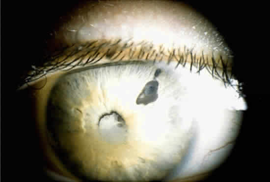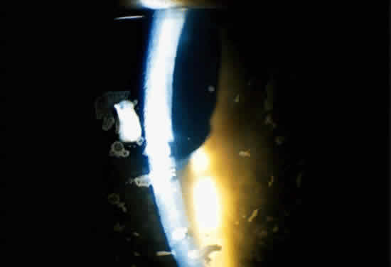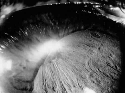 with JRA, where it is found in 30% to 55% of patients.1,2,75 Band keratopathy usually occurs in the interpalpebral area. It typically begins at the periphery as grayish white opacities. The opacification may spread centrally and in time may form a complete band in the interpalpebral zone. A lucid interval is noted between the band and the limbus, because Bowman's layer does not extend to the absolute limbus.75 Small lucid areas are noted in the opacity, representing regions where corneal nerves penetrate Bowman's layer. The presence of these holes imparts a “Swiss cheese” appearance to band keratopathy when examined at the slit lamp. The reason for the deposition of calcium in the interpalpebral area is unclear, but it may result from an elevation of pH in this area because of tear evaporation.74,76 Band keratopathy does not need to be treated unless there is a decrease in visual acuity or significant foreign body sensation or discomfort. If treatment is desired, it can be accomplished with disodium ethylenediamine tetraacetate (EDTA). Calcium EDTA should not be used. The corneal epithelium must first be removed with a blade or a spatula. A 2% to 3% solution of EDTA is then applied to the area of band keratopathy. This is most easily accomplished by rubbing the affected corneal surface with a cellulose sponge dipped in the EDTA solution. The cornea is repetitively wiped in this fashion, removing the abnormal deposits. Care must be taken to avoid application to uninvolved areas of cornea or to the conjunctiva, because EDTA is very irritating to the ocular surface. This procedure can be repeated as often as is necessary to maintain vision and prevent discomfort (Fig. 7).