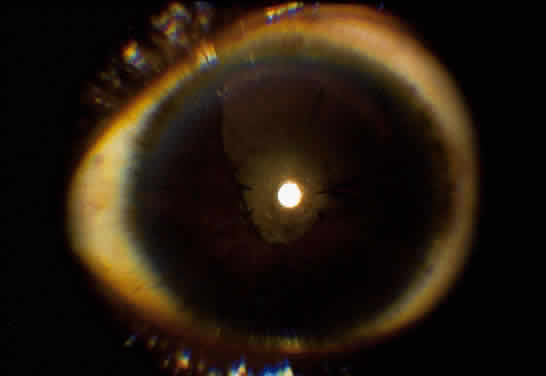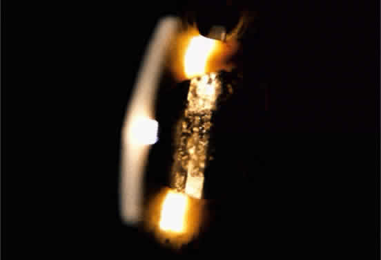 examination at the slit lamp with a contact, Hruby, 78 or 90 D lens. Frank