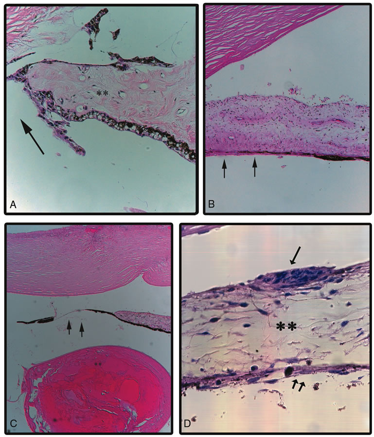 | Pathologic changes in the iris and consequent clinical appearance may vary depending on the layer of the iris involved. Iris stromal atrophy causes stromal thinning and results in loss of iris crypts and the surface texture. Also accompanying degeneration or loss of stromal melanocytes might alter the color of the iris. Degenerative changes may include loss of normal iris stroma being replaced collagenous tissue that might appear whitish in color on slit lamp examination (Fig. 1A). Iris atrophy may be limited to the iris pigment epithelial layer (Fig. 1B). This may be seen in conditions such as pigmentary glaucoma,1 diabetic changes2 in the iris as well as chafing of the posterior iris surface after sulcus implantation of an intraocular lens3,4 (Fig. 1C). Such localized atrophy of the iris pigment epithelium would clinically show normal or slightly altered anterior iris and the presence of transillumination defects in the iris. Iris atrophy might also involve both stroma and the iris pigment epithelium where there might be focal or generalized loss of both layers giving a moth-eaten appearance to the iris or polycoria such as is seen in iridocorneal endothelial syndrome5 (Fig. 1D). |