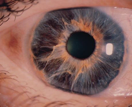 | Atrophy of both the iris stroma and the pigment epithelial layer occurs as a natural aging process. Elderly patients may note a change in the iris to a more blue color but these changes are usually not symptomatic. |