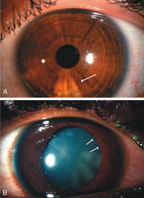 Iridoschisis may be associated with glaucoma in approximately 50% of the patients.8,18 The role of glaucoma in the pathogenesis of iridoschisis is, however, controversial. It has been hypothesized that iridoschisis may result in a secondary form of glaucoma where the ruptured stromal fibers form anterior synechiae that block trabecular outflow.19 Others believe that the schisis in the iris is a result of iris stromal ischemia following acute elevation of intraocular pressure. Ultrasound biomicroscopy demonstrates narrowing of the angle, diffuse or discrete iris stromal changes with intact pigment epithelium in familial iridoschisis and it is suggested that such patients may be predisposed to angle closure glaucoma.20 Treatment Except for being alert to the possible relationship to angle-closure glaucoma, no specific therapy is warranted for iridoschisis. IRIDOCORNEAL ENDOTHELIAL SYNDROME Etiology Iridocorneal endothelial syndrome (ICE) denotes a spectrum of ocular disorders that includes progressive essential iris atrophy, Chandler's syndrome, and iris-nevus syndrome of Cogan-Reese.5,21–26 It is included in this chapter because these ocular disorders were previously referred to as the essential iris atrophies. The defect appears to be an abnormality of the corneal endothelium, that results in endothelial cell proliferation causing a monolayer of endothelial cells with an underlying basement membrane to extend across the anterior chamber angle and onto the anterior surface of the iris.27–29 The contracture of the membrane results in iris atrophy and defects as well as the peripheral anterior synechiae that causes secondary glaucoma. An inflammatory and/or viral process has been implicated in the pathogenesis of the syndrome. Alvarado et al.30 used the polymerase chain reaction to detect herpes simplex virus DNA in corneal specimens with the ICE syndrome and the herpes simplex virus (HSV) was also isolated from the aqueous humor of a patient with ICE syndrome.31 Endothelial cell metaplasia is demonstrated in corneal specimens with ICE syndrome as shown by expression of various cytokeratins that are expressed in the corneal endothelium.32,33 Clinical Features It is the appearance of the iris that divides this spectrum of diseases into clinical variations.34 The most familiar form is progressive iris atrophy or essential iris atrophy in which there is marked corectopia, extensive and progressive atrophy of the iris producing a pseudopolycoria (Fig. 4A).22,27,28 In Chandler's syndrome, the iris shows only mild stromal atrophy and/or corectopia with predominant corneal changes.25 In the iris-nevus syndrome of Cogan-Reese, nodular or diffuse pigmented lesions are present on the surface of the iris in association with varying degrees of corectopia and atrophy of the iris (Fig. 4B).24,26 In the iris-nevus syndrome, these benign lesions of the iris may be confused with malignant melanoma. Although there is some overlapping of findings in this group of disorders, the complaint of the patient depends on which variant dominates. For example, in progressive iris atrophy, the complaint is the change in the appearance of the iris (i.e., polycoria); in Chandler's syndrome, the patient complains of visual disturbance secondary to the corneal edema; in iris-nevus syndrome, the acquired heterochromia is the usual complaint. Examination of these patients reveals the aforementioned iris changes, and common to all variants is the peripheral anterior synechiae and secondary glaucoma. On slit-lamp biomicroscopy there is a fine, stippled appearance of the posterior cornea resembling fine-hammered silver, similar to but less coarse than that of Fuchs' dystrophy. Clinical specular microscopy often reveals the abnormality of the corneal endothelial cells, characterized by variable degrees of pleomorphism in size and shape.29–35 Unilateral desquamating endotheliopathy may represent an incipient form or a form fruste of the iridocorneal endothelial syndrome.36 Treatment Management is directed to control of the corneal edema and the secondary glaucoma. The corneal edema if present is first treated by medical means (hypertonic saline) and may in due course may need penetrating keratoplasty. Management of the secondary glaucoma is challenging and is first treated with topical medications to control the elevated intraocular pressure. Such patients might eventually need filtration surgery or a seton procedure. Multiple procedures are often needed to achieve successful control intraocular pressure.37,38 |