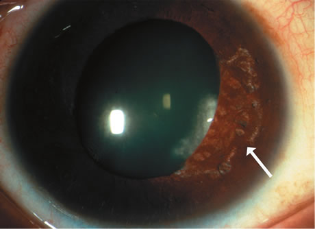 Iris atrophy may also be associated with pigmentary glaucoma and pigment dispersion syndrome where peripheral radial transillumination defects representing iris pigment epithelial atrophy are noted.52 In addition exfoliation syndrome may be associated with atrophic changes of the iris at the pupillary border with associated transillumination defects.53,54 NEUROGENIC In neurogenic atrophy, such as in association with neurosyphilis or lesions of the ciliary ganglion, the atrophy may start as an alteration in the pigmentation, either depigmentation or focal areas of hyperpigmentation. Thereafter, patchy or generalized atrophy of the stroma develops. In patchy atrophy the pupil is irregular and the part of the pupil corresponding to the atrophic zone has the greatest radius of curvature.55 ISCHEMIC Ischemic atrophy is best characterized by the discrete focal white patches of stromal atrophy occurring at the pupil or between the pupillary margin and the collarette.40–42 It may be associated with sickle cell disease (Fig. 10) and other causes of anterior segment ischemia.56–58 Hypoperfusion can produce a patchy stromal atrophy with secondary micro-neovascularization,59 and an acute primary ischemic iris atrophy can occur with occlusion of the greater vascular circle of the iris.60 An ischemic form of atrophy has also been described with quinine toxicity.61