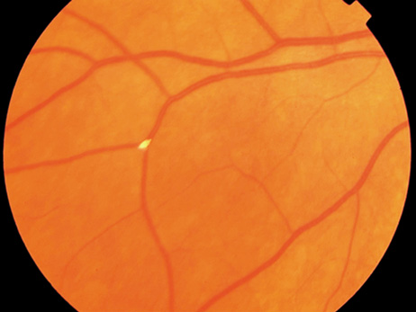 patients to this condition.35 The two main complications of NBTE are valve damage and embolic events. Valve damage often causes cardiorespiratory difficulties resulting from hemodynamic alterations. Emboli can cause infarctions of many organ systems, including the kidney, central nervous system, and gastrointestinal tract. The size of the vegetations varies from microscopic to about 4 mm. Autopsy studies have shown systemic embolization in approximately 40% of patients with NBTE.34,36 The ocular findings of NBTE include intraretinal hemorrhages, and branch (Fig. 4) and central retinal artery occlusion.37 Patients also may present with visual disturbances resulting from stroke, including gaze and visual field abnormalities.38,39 |