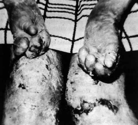 Symptoms in the hereditary form of EB tend to appear shortly after birth or in early childhood, and they reappear periodically during the patient's life. Epidermolysis bullosa simplex is the mildest form, and only 2% of these patients have any mucosal involvement. The mucosae are not involved in the hands-feet form. The recessive forms, epidermolysis bullosa letalis and dysplastic epidermolysis bullosa dystrophica, have mucosal involvement uniformly; conjunctival disease, although less common than oral disease, may be severe.105 Epidermolysis bullosa dystrophica is characterized by scarring of the skin over limbs, hands, and feet. The scars become keloidal, resulting in deformities of the limbs, hands, and feet; these are most severe in the dysplastic form (Fig. 17). The most severe involvement of mucous membranes also occurs in the dysplastic, recessive form of epidermolysis bullosa dystrophica.106