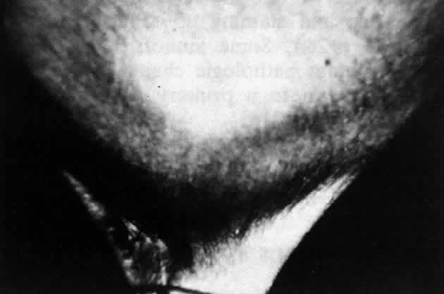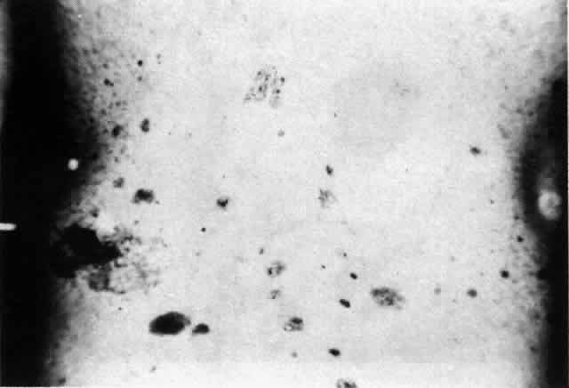 Ectodermal dysplasia, in conjunction with ectrodactyly and cleft lip and palate, has been reported as a syndrome.235,240 These patients exhibit photophobia, chronic blepharitis, entropion, lacrimal system anomalies, and corneal scarring. Reported systemic anomalies have included congenital absence of one kidney, deformities of the external ear, hypoplastic nipples, and multiple small cutaneous melanomas.240 Corneal changes associated with ectodermal dysplasia have been attributed, in some cases, to deficient lacrimation.238 However, Baum and Bull believe that the corneal disease is due to an inherent epithelial defect. Their patient exhibited diffuse stromal opacification in the upper third of both corneas, beginning as superficial stromal infiltration and later becoming more diffuse, opaque, and vascularized. A keratoplasty was performed, but the graft became opacified when it failed to re-epithelialize. The authors suggest that this failure to re-epithelialize was due to the basic ectodermal defect in the host epithelium.235 Treatment There is no known effective treatment for this disorder. MALIGNANT ATROPHIC PAPULOSIS Definition Malignant atrophic papulosis, or Degos' syndrome, is a rare endovasculitis that affects the skin, intestine, eye, and other organs. It is usually a rapidly fatal disease affecting primarily young and middle-aged men.241,242 Clinically, these patients develop disseminated papular lesions of the skin over the front of the trunk and proximal parts and flexor surfaces of the extremities. Eyelids, hands, and oral mucosa may also be involved.241 Presenting as pink-to-red round or oval papules 2 to 10 mm in diameter, these lesions progress to form porcelain-white atrophic central depressions that are often surrounded by telangiectasia (Fig. 36).241