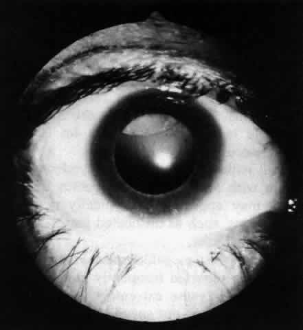 Cardiovascular anomalies are found in more than one third of all patients with Marfan's syndrome and are potentially the most serious symptom. Death in patients with Marfan's syndrome is usually due to heart disease. Most pathology is centered about the aortic valve and ascending aorta, in which a degenerative process of the tunica media leads to the formation of dissecting aneurysms. When this type of vascular disease occurs in young patients, Marfan's syndrome must always be suspected. Occasionally, dissection occurs acutely and the patient complains of a tearing pain in the precordium and suddenly develops a new loud murmur. Other valves may also be affected, and the characteristic murmurs of mitral and tricuspid insufficiency are diagnostic. The lungs are the seat of varied anomalies, including abnormal lobulation, cystic malformations, aplasia of parts of the lungs, progressive emphysema, and, occasionally, fibrosis of no apparent inflammatory etiology. In the genitourinary system, small mobile kidneys may be found and ureteric strictures may be present which predispose to recurrent bouts of pyelonephritis. Epidermal striae are found, and a remarkable lack of subcutaneous fat is a nearly universal occurrence. Not all patients with Marfan's syndrome are tall and thin with long fingers and pectus excavatum. Patients may appear phenotypically normal with only eye signs, such as dislocated lenses, to suggest the diagnosis. Myopia, ptosis, megalocornea, and blue scleras have all been reported frequently in these patients. Strabismus is likewise extremely common, but its presence alone does not suggest the diagnosis. The anterior segment structures exhibit both subtle and gross changes, some of which (especially in combination) are extremely suggestive of Marfan's syndrome. The anterior chamber angle exhibits an immature ciliary body with hypoplasia of the muscular elements, a very broad trabecular meshwork, and an inconspicuous Schwalbe's line. Transillumination demonstrates that the iris has a very posterior insertion on the ciliary body, the processes of which extend radially behind the iris much more than usual. The iris tends to show no circumferential ridges, few crypts, and, occasionally, iris root cysts, while iridodonesis occurs when the lens is subluxated. One peculiar abnormality is a hypoplasia of the iris dilator muscle; this causes the pupil to remain small even in response to mydriatic drops. The principal lenticular anomaly is ectopia lentis. This is found in the vast majority of patients with Marfan's syndrome; it is usually bilateral and commonly occurs as a superior or supernasal displacement (Fig 29-6). This is presumably due to poor zonular attachments; for the same reason, lens colobomas may be found. Spherophakia and cataract formation also occur. Various types of retinal degeneration may be seen, including myopic and lattice degeneration and vitreous traction syndromes in the peripheral retina. Both retinal detachment and a peripheral pigmentary retinopathy are common.