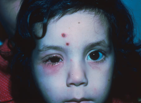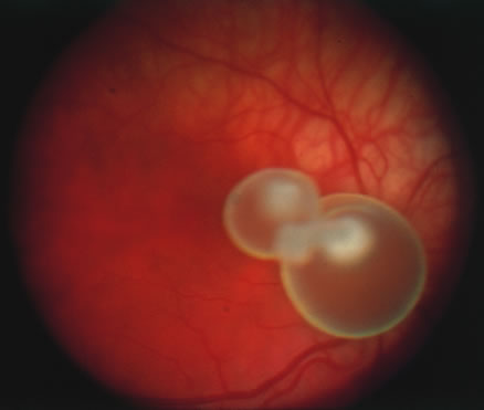 Both visceral larva migrans and ocular toxocariasis are clinical diagnoses based on signs and symptoms together with a history of exposure to ascarid infected pets or pica. The demonstration of larvae in biopsied material is difficult and rarely achieved. Toxocara ELISA serology and eosinophil count are the only useful laboratory tests in establishing the diagnosis of toxocariasis.160 Although the eosinophil count is usually elevated, a normal eosionphil count does not preclude the diagnosis. The ELISA test is both sensitive and specific in active cases of visceral larva migrans, but may not be as reliable in cases of ocular toxocariasis and long-standing visceral larval migrans. Visceral larval migrans is treated with antiparasitic drugs such as thiabendazole, usually in combination with oral corticosteroids to control inflammation caused by the death and necrosis of the larvae. Treatment of ocular toxocariasis includes antihelminthics, corticosteroids, laser photocoagulation, pars plana vitrectomy, and subretinal surgery.161 Prevention of infection through regular administration of antihelminthic agents to pets is essential. Trichinosis Trichinosis is caused by larvae of the nematode of the genus Trichinella. Trichinella spiralis is the most prevalent subtype, but T. pseudospiralis, T. nativa, T. nelsoni, and T. britovi are now also recognized. Periorbital edema occurs in approximately 90% of patients, and the extraocular muscles are commonly involved. The disease occurs worldwide, and is most common in the Untied States and Europe. Although the cases of trichinosis are steadily declining, prevalence of infection remains at approximately 2% in the United States. A recent case review from the CDC from 1991 to 1996 reported 3 deaths in 230 cases reported from more than 31 different states in the United States.162 Trichinosis is associated with the ingestion of undercooked pork, with sausage as the most commonly implicated pork product. Occasionally wild game meats such as bear, walrus, and cougar meat have also been associated with trichinosis. After ingestion of meat containing cysts, larvae are released from the cysts and invade the small bowel mucosa where they further develop into adult worms. Females then release larvae that migrate to skeletal muscle fibers where they encyst and later calcify.163 Extramuscular larvae die and may simulate granulomatous inflammation. The patient first experiences nausea, abdominal pain, and diarrhea lasting 1 to 2 days. A maculopapular rash, fever, and prostration may occur. Myositis ensues over the next weeks, presenting with muscle pain, tenderness, and weakness. The most well-perfused muscles are particularly affected including the diaphragm, intercostals, tongue, extraocular muscles, and the heart. Pericardial effusion is the most commonly reported manifestation with resolution of all cases at 6-month follow-up after treatment.164 Widespread nervous system disease may occur, presenting variably as polyneuritis, focal or diffuse paresis, meningitis, or encephalitis. Periorbital edema and pain with eye movements is common during extraocular muscle involvement. Conjunctivitis and subconjunctival hemorrhage also may occur. Diagnosis is based on clinical symptomatology, epidemiologic history, detection of Trichinella larvae in infected meat, serologic testing, and muscle biopsy. Eosinophilia is common in serologic testing and the rapid detection of T. spiralis larvae is now possible with polymerase chain reaction testing.165 Muscle biopsy may demonstrate viable larvae within the myofibrils or myositis with a predominance of eosinophils. Counts of 50 to 100 larvae per gram are associated with severe disease. Treatment is with oral albendazole or thiabendazole. Both are equally effective, but albendazole is often better tolerated.166 Patients with angioedema, urticaria, and myocardial or central nervous system involvement usually respond to prednisone. Analgesics and supportive measures are indicated. Prevention is achieved by storing meat in the freezer and thoroughly cooking the meat until it is no longer pink, which involves heating all portions of the meat to 60°C. The mortality rate is approximately 1% overall and less than 10% with central nervous system involvement. Focal deficits may persist. Echinococcus Echinococcus, also known as hydatid disease, is caused by the larval stage of the canine tapeworm Echinococcus granulosus, which produces characteristic tissue cysts throughout the body. The dog is the definitive host that becomes infected by ingesting the cyst-containing organs of the intermediate host, usually sheep, cattle, or pigs. Human infection usually occurs in children who ingest the eggs while playing in contaminated soil or by contact with infected dogs. The eggs hatch in the small intestine, and emerging oncospheres (larvae) penetrate the intestinal wall and are carried by the bloodstream to various organs where they develop into hydatid cysts. The liver is the most commonly affected organ, followed by the lung, spleen, brain and eye. The cysts typically grow slowly and do not produce symptoms for many years unless they are located in the eye or the central nervous system. Damage is caused by the mechanical mass effect of the growing cyst resulting in portal hypertension, pneumothorax, bone fractures, focal neurologic deficits and increased intracranial pressure. Spontaneous rupture of a cyst can cause serious allergic sequelae, including fatal anaphylactic reactions. E. granulosus occurs worldwide, and more frequently in rural, grazing areas where dogs ingest organs from infected animals. E. multilocularis occurs in the Northern Hemisphere, including central Europe and the northern parts of Europe, Asia, and North America. E. vogeli and E. oligarthrus occur in Central and South America.167 The overall incidence of ocular involvement in hydatid disease is small, even in endemic areas. Reports range from 0.63% to 2.9% of cases. Intr