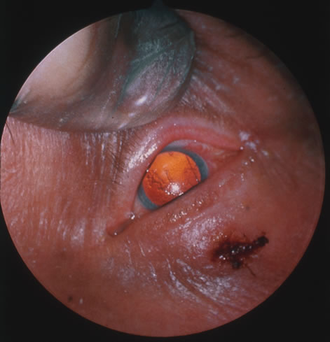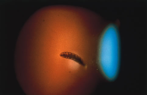Praziquantel and albendazole175 are effective for the treatment of cysticercosis. Taeniasis or intestinal infection is treated with a single dose of Praziquantel (5 to 10 mg/kg). Cystic extraocular muscle lesions with a scolex are treated with oral albendazole (15 mg/kg) for 4 weeks. The disappearance of subcutaneous and cystic brain lesions has been observed after Praziquantel therapy, along with clinical improvements in the majority of cases. Oral corticosteroids are frequently used in addition to the cysticidal agents to control the exacerbation of symptoms that occurs with treatment. The inflammation elicited by the dying cyst can be severe and fatal with high levels of infection.176 Cystic lesions without a scolex are treated with corticosteroids and observed. If there is no resolution oral albendazole is administered.177 Subconjunctival cysts should be excised. Ophthalmomyiasis Ophthalmomyiasis refers to invasion of the human eye by the larval form (maggots) of flies of the order Diptera. Fewer than 5% of cases of myiasis in humans manifest with ophthalmic involvement. Other forms of myiasis produce lesions of the skin, nasal cavity, ear, anus, vagina, intestine and bladder. Myiasis is more common in rural laborers who live in poor, crowded, unsanitary living conditions. The organisms are generally attracted to previously diseased and purulent tissue.178 The flies that infect humans are also responsible for diseases seen in cattle, sheep, deer, and horses.179 Myiasis has a worldwide distribution. Flies may deposit their eggs directly on the lid margins, or they may be transmitted by the patient's hand or a secondary vector such as a tick or mosquito. Ophthalmomyiasis may be subdivided into external and internal disease. External disease refers to involvement of periorbital tissue, including the palpebral region, cornea,180 and conjunctiva (Fig. 42). The eggs hatch, and the larvae burrow beneath the conjunctiva of the upper and lower fornices, producing small undulating nodules with concomitant conjunctival irritation. Internal ophthalmomyiasis is less common and occurs when the larvae penetrate the sclera and migrate into the anterior chamber, vitreous, or subretinal space (Fig. 43). When confined to the uveal tissue the larvae leave subretinal migratory tracts that are hypopigmented and hyperfluoresce on angiography.181 Vision is usually not disturbed unless the organism crosses the macula. The infiltrating larvae may invade the macula and optic nerve head resulting in total loss of vision.182 Rarely, the larvae invade the orbit and cause massive inflammation and destruction of its contents. The potential for bony erosion with fatal intracranial extension should not be overlooked.183,184 Early removal of fly larvae is essential to limiting intraocular damage and potential loss of vision (Fig. 44). In cases of posterior involvement this can be achieved through pars plana vitrectomy185,186 and retinectomy. Laser photocoagulation has also been used to destroy the organism obviating the need for invasive surgery.187 In cases of advanced disease enucleation or orbital exenteration may be required. |