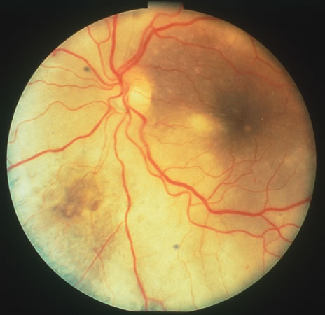 Diagnosis of varicella is usually not difficult, given the frequently obtainable history of exposure to a preexisting case and the characteristic rash. Serologic confirmation can be obtained by demonstrating increasing anti-VZV antibody titers. Multinucleated giant cells and eosinophilic intranuclear inclusions can be demonstrated by Papanicolaou's or other stains of smears from acute skin lesions. The clinical diagnosis of herpes zoster can be made in the presence of the characteristic vesicular lesions in a dermatomal distribution. Scrapings of the lesions demonstrate giant cells and intracellular inclusions. It is important to note that although most patients with herpes zoster are otherwise healthy, the possibility of an underlying systemic illness should be considered if the patient is young (i.e., younger than 50 years old) or the history suggests other systemic problems. The treatment of varicella is primarily supportive, consisting of analgesia, antipyretics, antipruritics, and good skin hygiene to prevent secondary infection. The use of aspirin in children is to be avoided in view of the belief that it may predispose to Reye's syndrome following varicella. Most eye disease is mild and self-limited and does not require treatment. Oral acyclovir (Zovirax) given five times daily early in the course of zoster infection has been shown to reduce the duration of viral shedding and the severity of acute pain. The greatest benefit is seen when medication is begun within 72 hours of onset of skin lesions. Two newer antiviral agents available for the treatment of herpes zoster are valacyclovir (Valtrex) and famcyclovir (Famvir). These agents have the advantage of a simpler dosing regimen, three times daily rather than five times daily with acyclovir, and a more favorable pharmacokinetic profile.13 It is thought that famcyclovir may also help speed resolution of postherpetic neuralgia. Valacyclvoir and famcyclovir are now preferred to acyclovir as first-line therapy for the treatment of zoster. They are well-tolerated drugs with few systemic side effects other than a requirement for reduced dosing in patients with renal failure. Oral corticosteroids also seem to have a beneficial effect in reducing acute pain and speeding cutaneous healing. They have not been shown to have an effect on postherpetic neuralgia. Topical corticosteroids and cycloplegics are commonly used to treat the inflammation associated with herpes zoster ophthalmicus.10 Tear supplements, bandage contact lenses, surgical correction of lid abnormalities, and tarsorrhaphy may be necessary to promote the healing of epithelial defects. Vision-threatening pathologic processes such as chorioretinitis and optic neuritis should be treated aggressively with intravenous acyclovir and high doses of prednisone. Treatment of postherpetic neuralgia is often disappointing. Routine analgesic drugs are generally ineffective. Cimetidine, colchicine, phenothiazines, and tricyclic antidepressants have been used with some success. Capsaicin cream and lidocaine patches may also be applied for local relief. The pain tends to slowly diminish and disappear over the course of 1 to 2 years but may be prolonged, especially in elderly patients. For those with severe intractable pain, intrathecal injection of methylprednisolone acetate once weekly for 4 weeks has recently been shown to provide relief.14 CYTOMEGALOVIRUS INFECTION Cytomegalovirus (CMV) is a herpes virus responsible for severe congenital malformations, a mononucleosis syndrome in young adults, and disseminated lesions in the immunosuppressed, especially retinal infection and pneumonia in patients with acquired immunodeficiency syndrome (AIDS). Patients with AIDS with CD4 counts between 50 to 100 cells per microliter are particularly susceptible to CMV retinitis. If the retinitis is untreated the prognosis is very poor often resulting in full-thickness retinal necrosis and blindness. Despite treatment, CMV retinitis often recurs in up to 50% of cases.15 In the United States, 20% of people are seropositive for CMV by age 20. Approximately 1% of infections are congenital and 5% perinatal. Anti-CMV immunoglobulin (Ig) G is present in greater frequency in homosexual men, on the order of 80% to 90%. The virus may be transmitted via blood, cervical secretions, semen, and breast milk and as an intrauterine infection. Serologic testing for CMV is not routinely performed because of this frequent exposure in the general population. Approximately 10% of congenitally infected newborns have permanent sequelae. The full syndrome is manifest as hepatosplenomegaly with hepatitis and cirrhosis, maculopapular rash, purpura, hemolytic anemia, pneumonia, microcephaly, microgyria, encephalitis, chorioretinitis, pathologic bone fractures, and growth retardation. Otherwise asymptomatic children may develop late sensorineural hearing loss or mental retardation. In normal older children and adults, the most common manifestation is an atypical mononucleosis, comprising fever and lymphocytosis with atypical lymphocytes. Lymphadenopathy and pharyngitis may be present, and rubelliform rashes occur. Heterophil antibodies are negative. In the immunocompromised, especially organ transplant recipients and patients with AIDS, CMV commonly is responsible for serious clinical syndromes. It causes an interstitial pneumonia, resulting in dyspnea and dry cough, with interstitial infiltrates on the roentgenogram. Subacute encephalitis, enterocolitis, adrenalitis, and adrenal necrosis may be noted. CMV retinitis is common in patients with AIDS. Perivascular granular white or yellowish infiltrates with hemorrhage are typical (Fig. 7). Minimal vitritis or anterior uveitis may be present. The posterior pole, including optic nerve, or peripheral retina may be involved. Optic neuritis may be retrobulbar. Resolution of retinal lesions reveals local retinal atrophy and pigment dispersion. Iridocyclitis may occur secondary to infection of