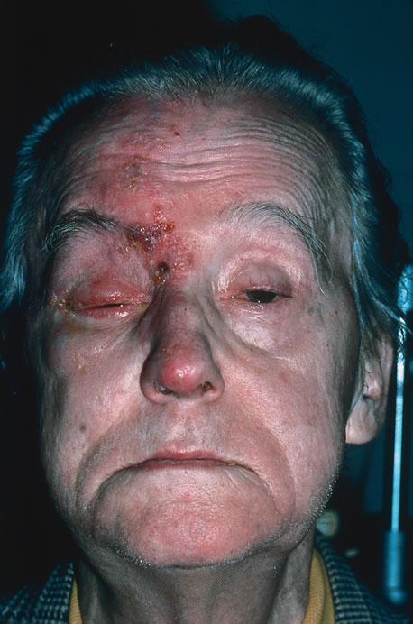 Congenital HSV infection is recognized at birth by jaundice, hepatosplenomegaly, central nervous system abnormalities, bleeding diatheses, microcephaly, seizure disorders, fever, chorioretinitis, and skin vesicles. It must be differentiated from similar syndromes caused by rubella, toxoplasmosis, and cytomegalovirus. Neonatal infection may be acquired in passing through the infected birth canal or by retrograde spread of the infection into the uterine cavity. Less common presentations of HSV infection include primary infections of the skin of the fingers (whitlows). These are caused by HSV type 1 in medical and dental personnel exposed to oral secretions. In the general community this lesion is caused by HSV type 2 infection. HSV type 1 may also cause a skin infection that mimics herpes zoster, although the dermatomal distribution is not usually maintained and the pain is less severe. On rare occasions, herpes simplex can cause a necrotizing hemorrhagic encephalitis of the temporal lobes marked by rapid deterioration to coma and death. Reactivation of HSV may be precipitated by fever, trauma, menstruation, emotional stress, or systemic illness. Recurrent episodes of HSV type 1 and type 2 are generally preceded by several hours of burning, itching, and tingling before the skin vesicles appear. Systemic symptoms tend to be mild or absent, with the exception of recurrent adenopathy. The lesions appear similar to the primary infection and are frequently painful. The most frequent regional recurrences of HSV type 1 are on the vermilion border of the outer lip (herpes labialis) and in the eye (Fig. 2). Recurrences of HSV type 2 characteristically produce lesions on the penile shaft and glans in the male and on the labia and perineum in the female. Headache and aseptic meningitis are occasionally associated with a genital recurrence. Further recurrences may be seen at monthly or yearly intervals.